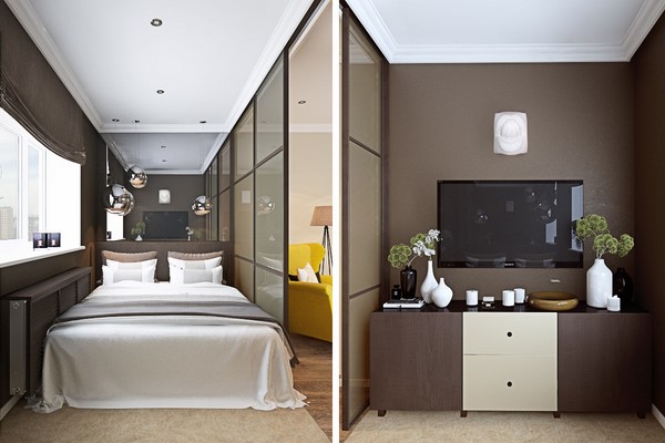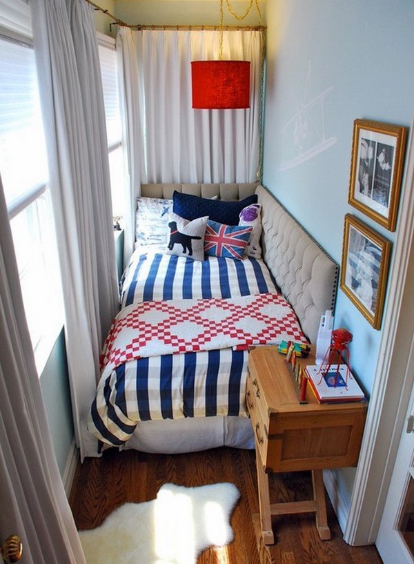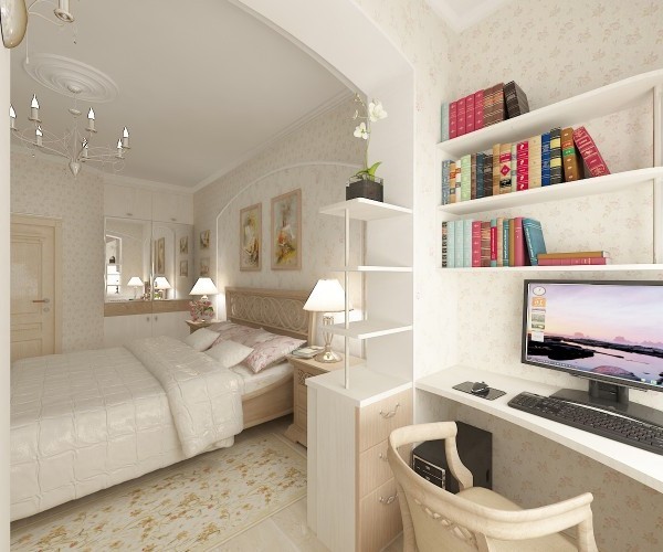 Places pour accueillir la zone de travail, beaucoup n'est pas nécessaire. Une petite table, une chaise d'ordinateur - et le lieu de travail est prêt. Sur les murs, vous disposez de beaucoup d’espace pour ranger de petites étagères, où vous pouvez en toute sécurité accueillir tout ce dont vous avez besoin dans votre bureau.