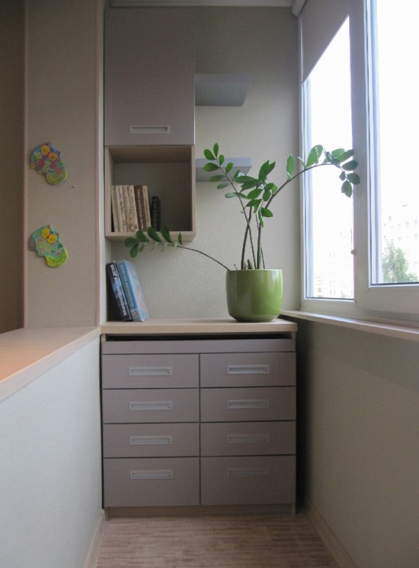 Mais pour plus de commodité, l’intérieur du balcon ou de la loggia devrait inclure une table avec une chaise ou un petit pouf, un meuble de rangement pratique où seront situés tous les outils et éléments nécessaires à la créativité ou au savoir-faire.