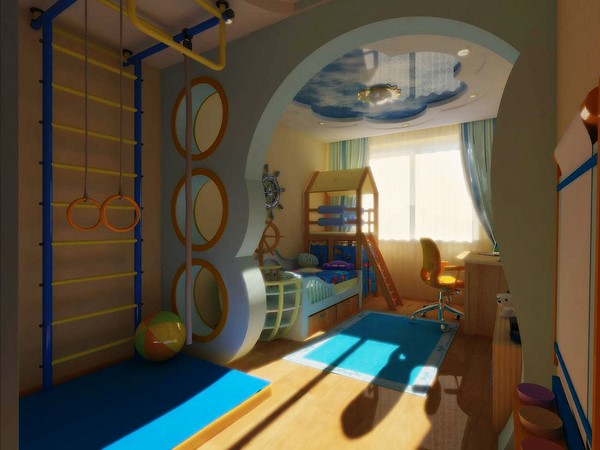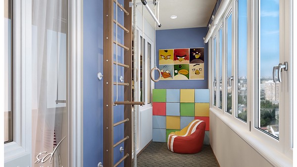 Si l'enfant a déjà une crèche, mais que le balcon est vide, créez ici, en plus de l'espace de travail pour l'enfant, une petite salle de sport pour les jeux et le sport, en plaçant un mur suédois et d'autres articles de sport.