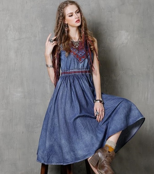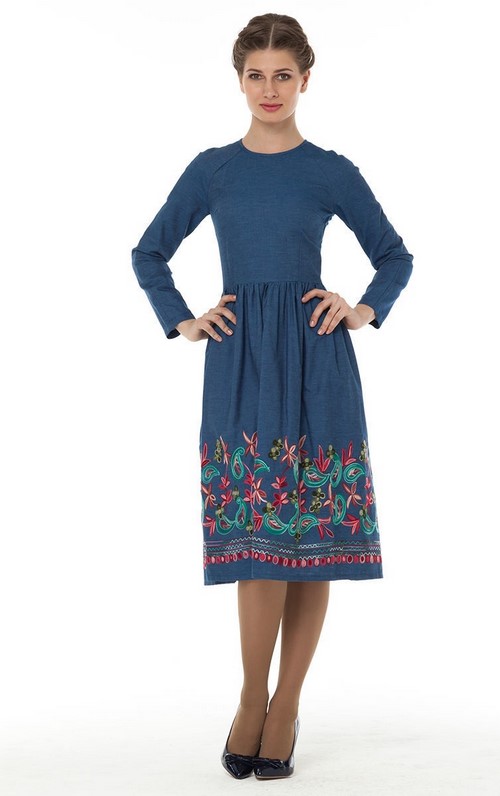 L'option idéale est les robes en jean 2025-2026 a-line, élargissant à partir de la ligne de la poitrine, les robes en jean avec une belle encolure, une petite manche ou une manche à trois manches, d'élégantes robes soleil en jean au sol avec des broderies.