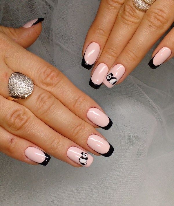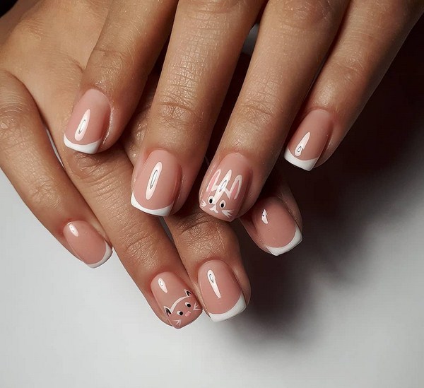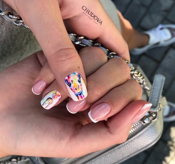 Vous ne devez pas associer le style français de conception de souci à un style sobre: les maîtres suggèrent d'aller au-delà et d'essayer une veste à la mode intéressante avec des dessins de lapins, de girafes et d'autres animaux que vous aimez et pas seulement. Un tel nail art français ne passera certainement pas inaperçu!