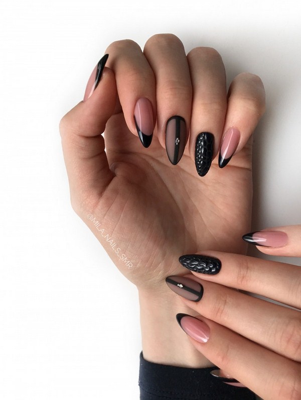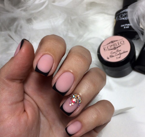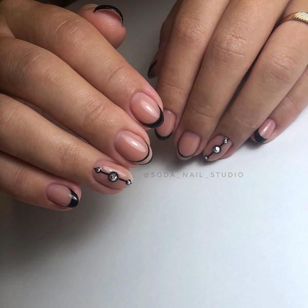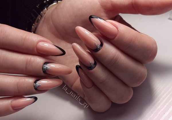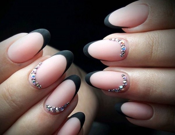 Une version mégastile et cool de la veste pour les amateurs de laconicisme spectaculaire - Black French manucure 2025-2026. Adoucissez la couleur noire et rendez la veste sombre plus attrayante grâce à la force des pierres de strass et des pierres, base pastel en couleur poudrée, paillettes scintillantes et imprimés. Le design français noir sur les ongles “amandes” et “carré” est idéal.