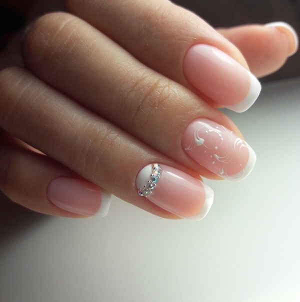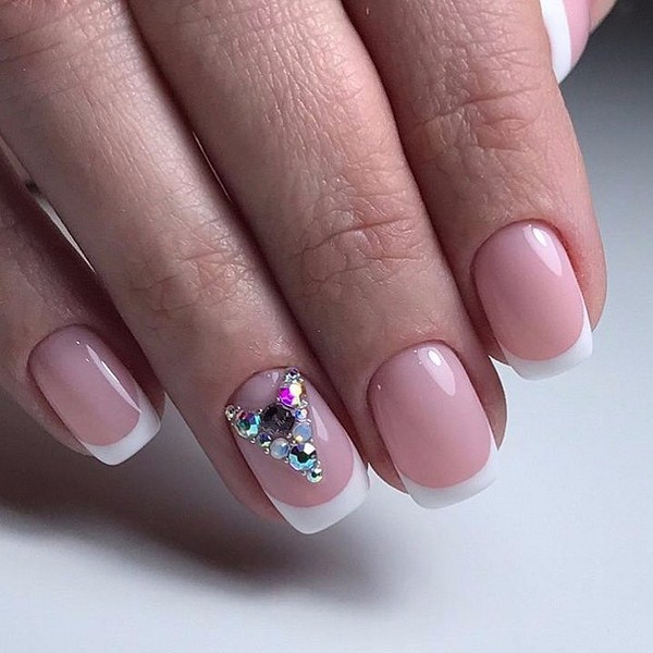 Quand vient le temps des vacances et qu'il est temps de trouver un design à la mode pour vos ongles, choisissez une manucure française avec des strass dans une nouvelle vue, et vous ne perdrez pas! Des bandes de strass, quelques cailloux près du trou, des couronnes de strass dans les trous et diverses figures de cailloux aideront à réaliser la veste chic souhaitée avec des strass pour la soirée.
