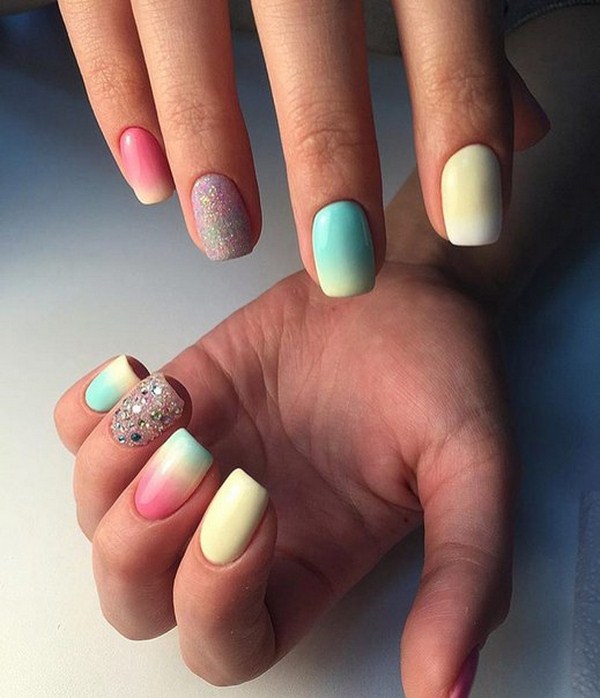 La veste de printemps et d'été ne peut pas être tenue sans la technique de l'ombre, qui ajoutera de la tendresse et de l'harmonie aux nuances vibrantes de couleurs vives de vos doigts. La veste Gradient est également efficace pour la saison automne-hiver avec des nuances sombres ou froides. Vous pouvez jouer avec un «sourire» dégradé ou créer un ongle ombré qui met en valeur le bord libre d'un ongle dans une nuance différente pour une manucure française à la mode.