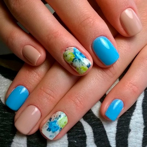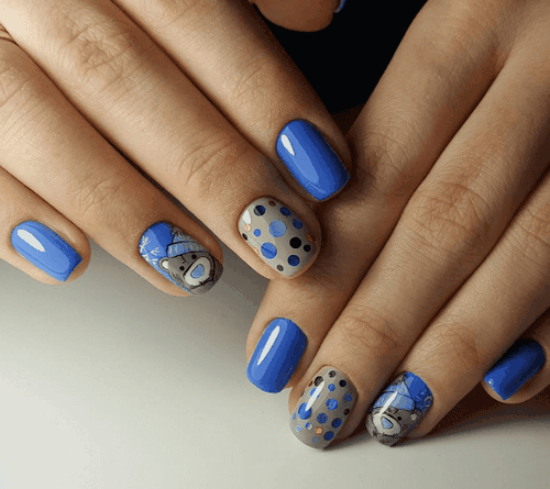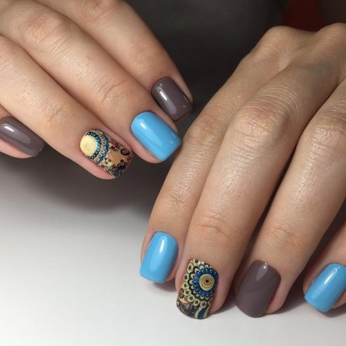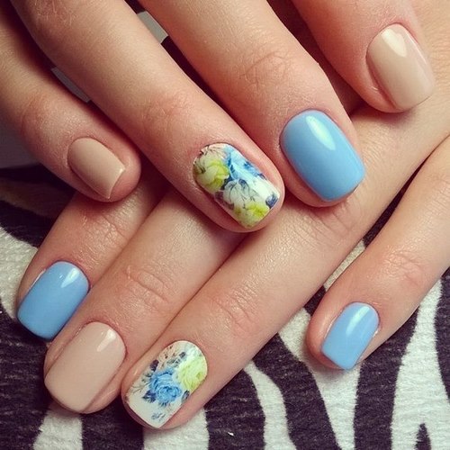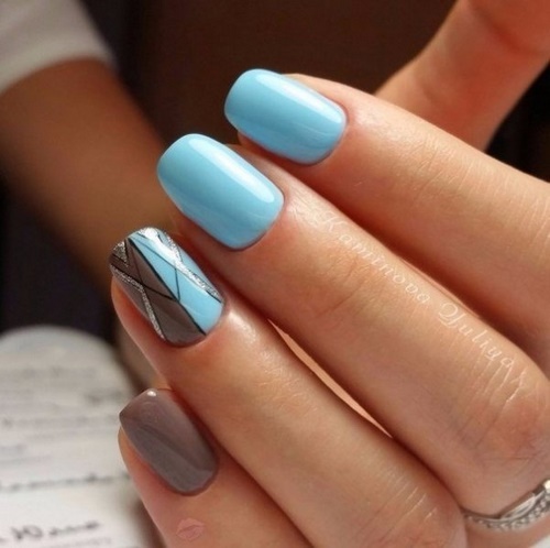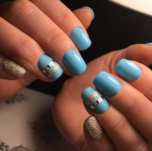 Une multitude de nuances vous permet de combiner une manucure bleue avec des tons blanc, rose, brun, beige, vert, doré, argenté, rouge, vert clair, noir, bleu profond et autres.
