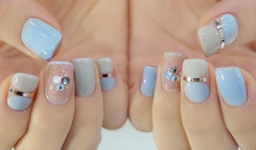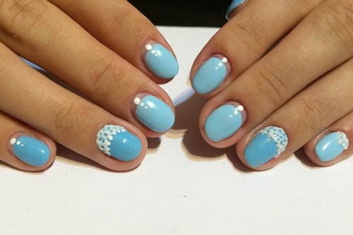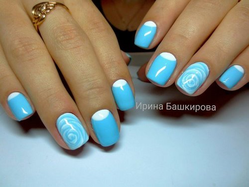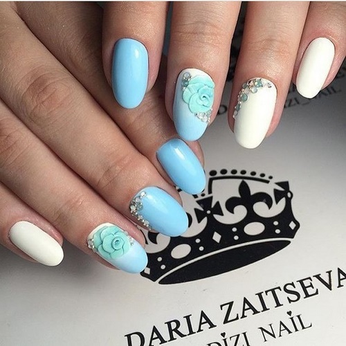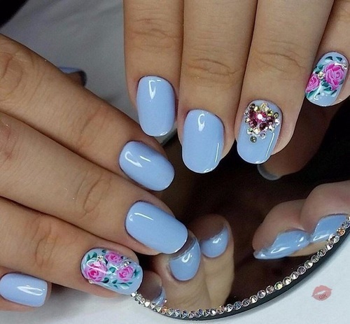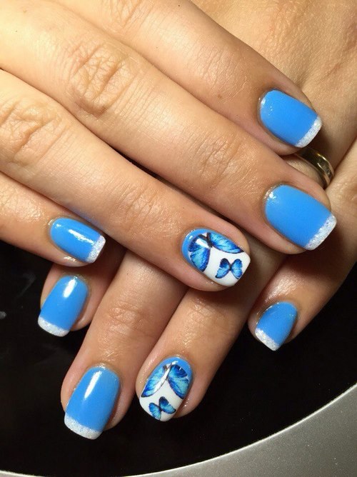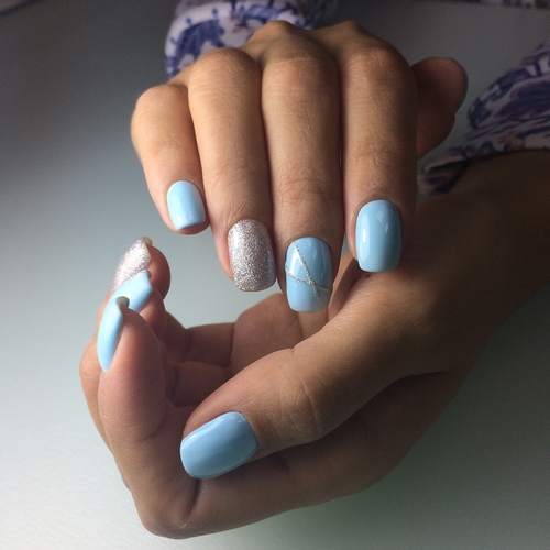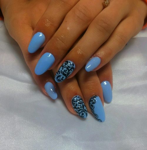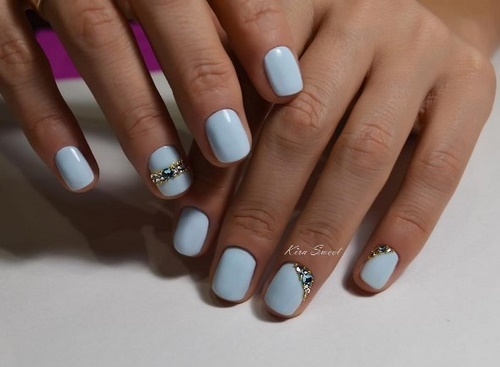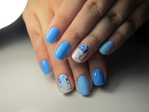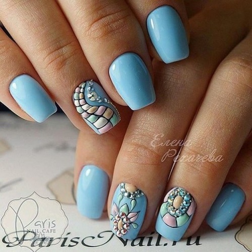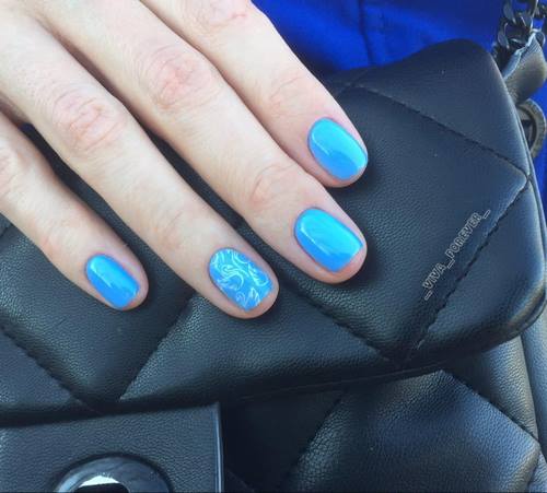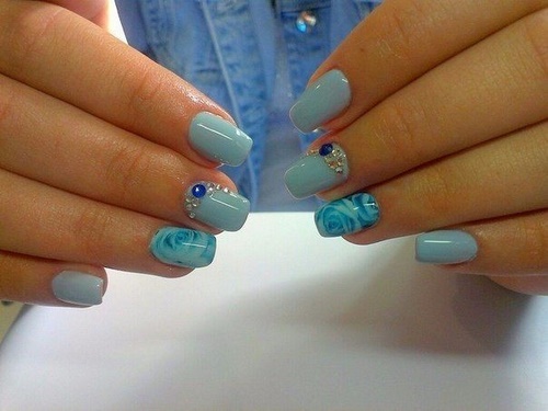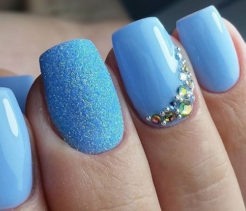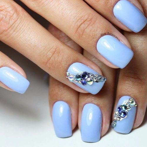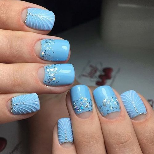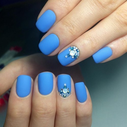 La manucure bleue peut être complétée avec des strass, en la posant sur le trou avec un ovale ou un triangle, en arrangeant les strass, en complétant un motif ou un dessin, en faisant une bande de paillettes, une figure, un bloc, décorer les ongles avec des bracelets de plusieurs minuscules chaînes, etc.