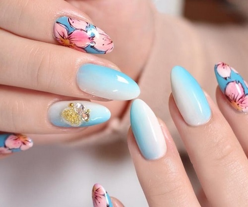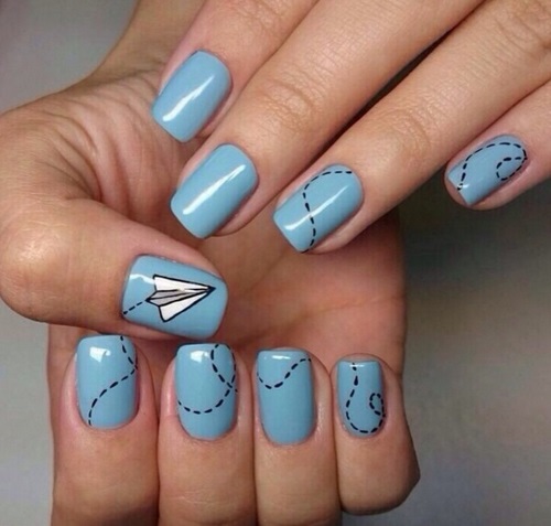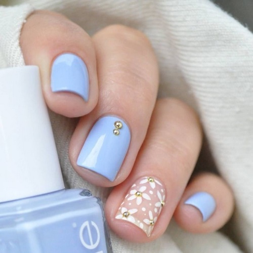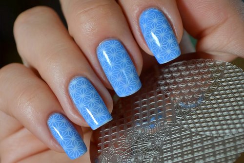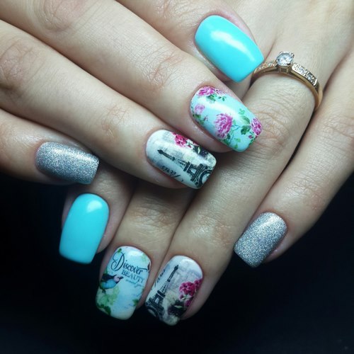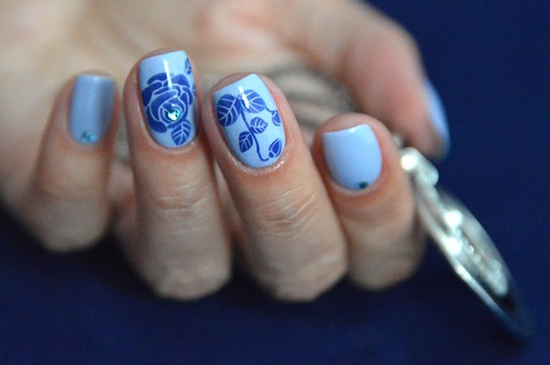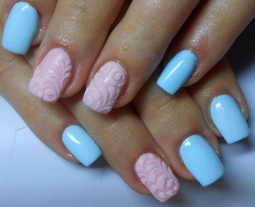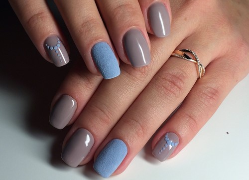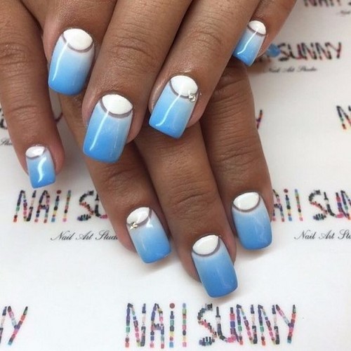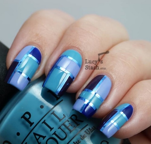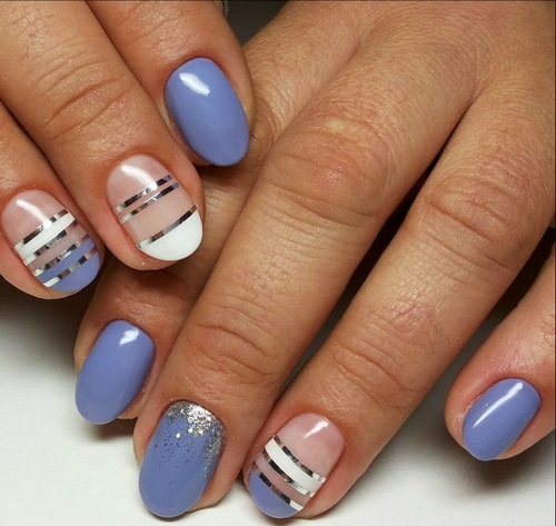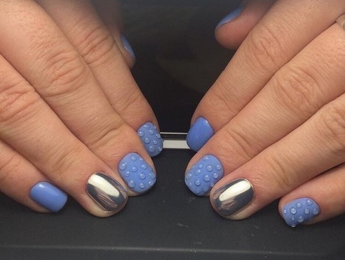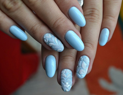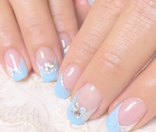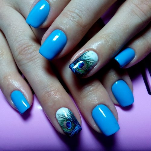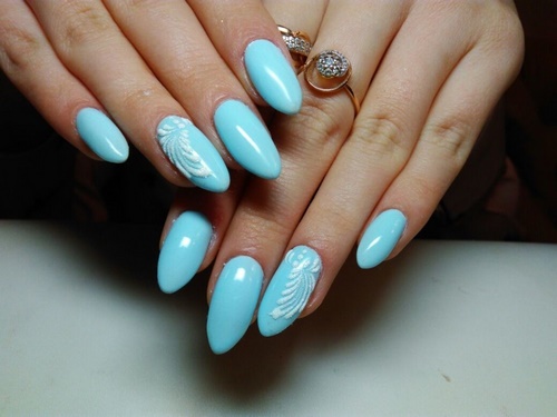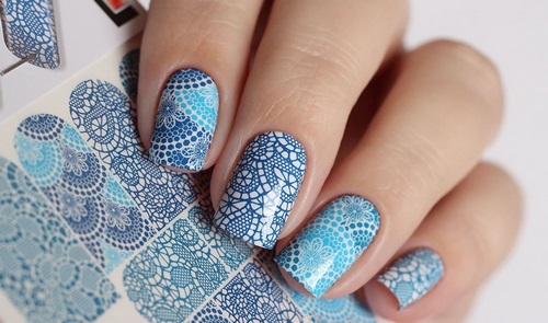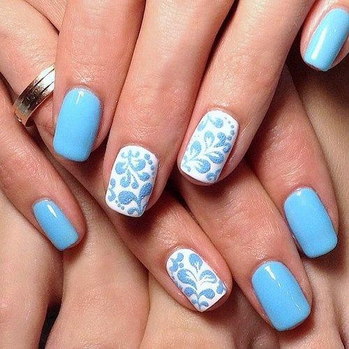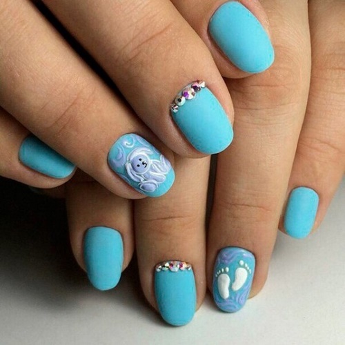 La manucure bleue peut être complétée avec des strass, en la posant sur le trou avec un ovale ou un triangle, en arrangeant les strass, en complétant un motif ou un dessin, en faisant une bande de paillettes, une figure, un bloc, décorer les ongles avec des bracelets de plusieurs minuscules chaînes, etc.