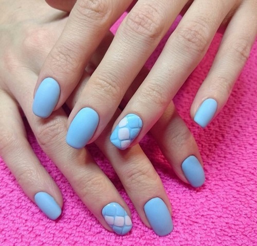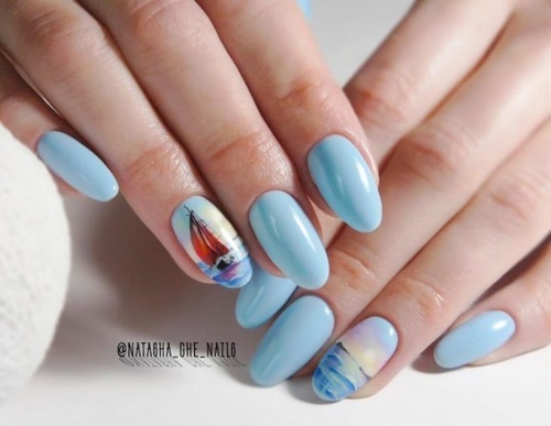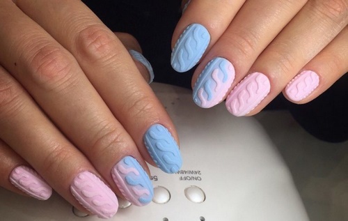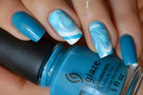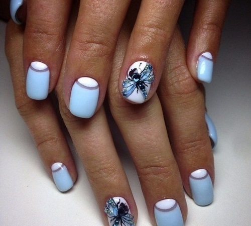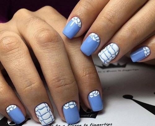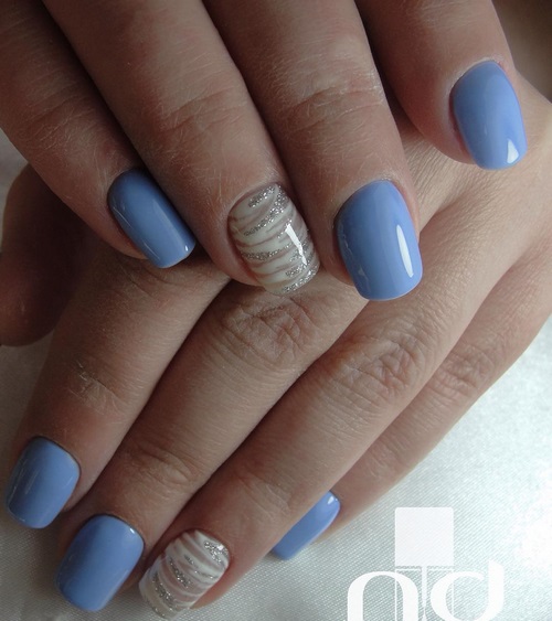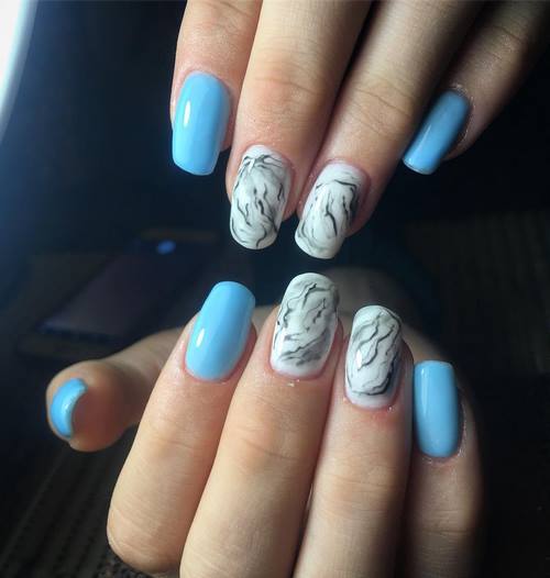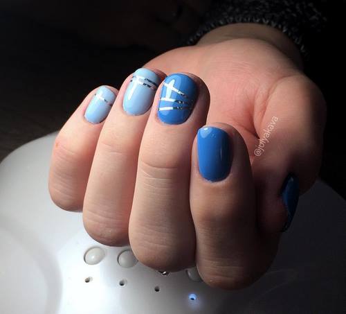 Soit dit en passant, il est judicieux de compléter le dessin de l’ongle bleu avec un marquage ou des autocollants au cas où il vous serait difficile de dessiner vous-même, de créer une eau, un marbre, une manucure tricotée bleue, de jouer avec les contrastes et les nuances dans des variations ombrées.