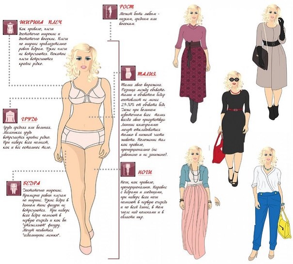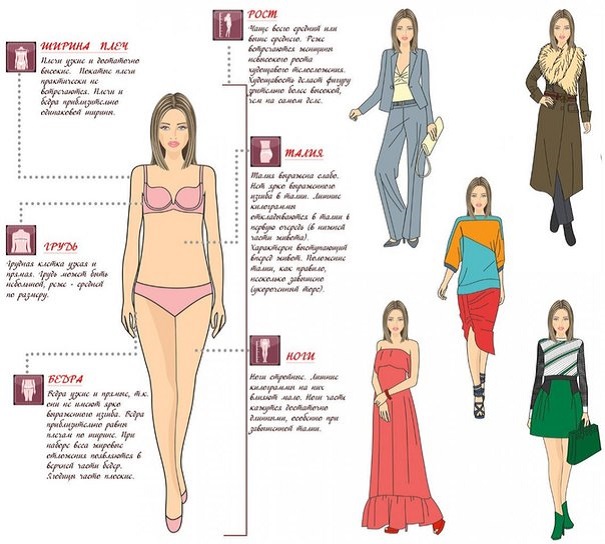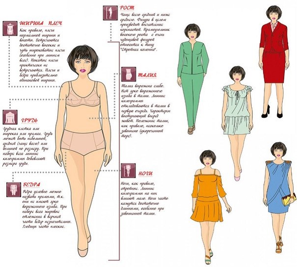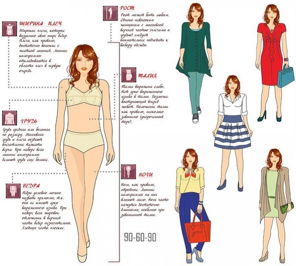 Et maintenant, quand vous savez déjà quel type de silhouette vous avez, nous déciderons comment vous habiller correctement en fonction du type de silhouette. Pour vous indiquer quels vêtements conviennent à un type de silhouette particulier, nous avons préparé des recommandations pour chaque type de silhouette.