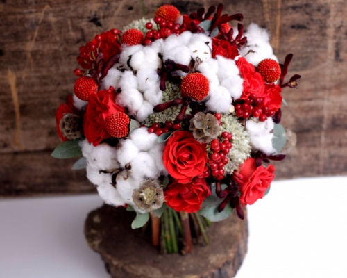 Les bouquets à la mode pour la saison d'hiver ne doivent pas inclure que des fleurs. Souvent, dans les bouquets d'origine, ajoutez une variété d'éléments décoratifs et même des décorations, par exemple des cônes, du coton, des perles, etc.