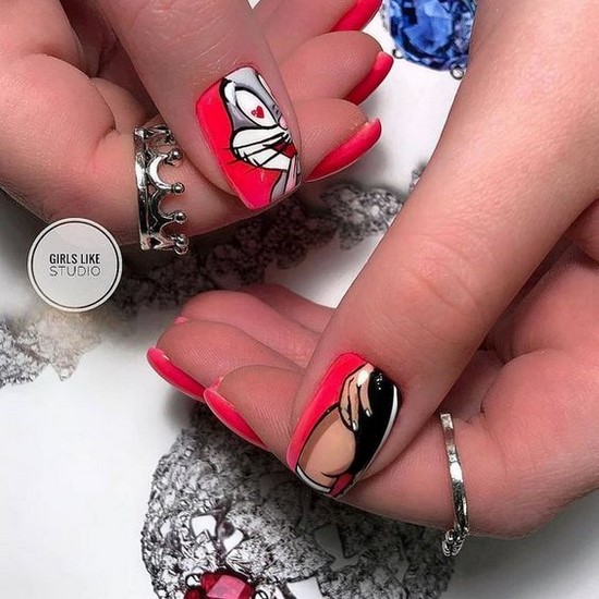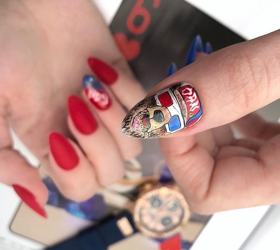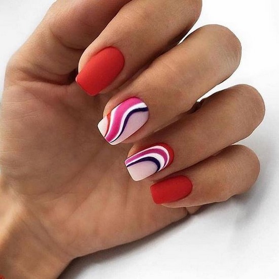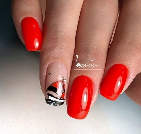 Tout est possible en été, vous pouvez donc décorer des ongles rouges avec des fruits, des baies, des dessins mignons et drôles, des portraits, des phrases.