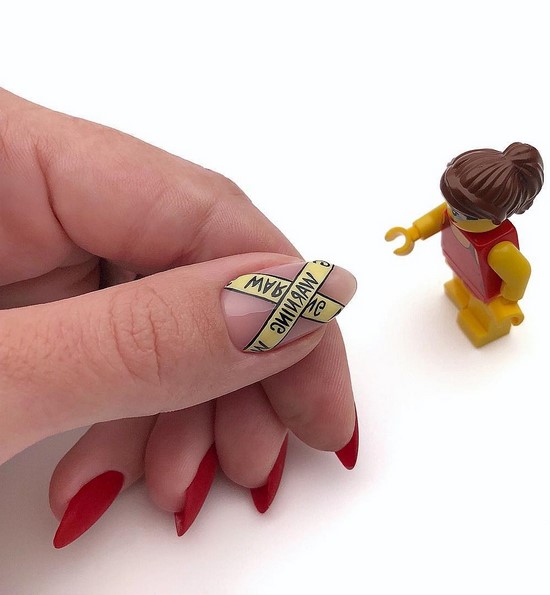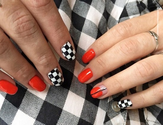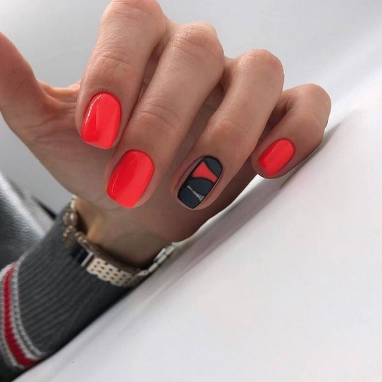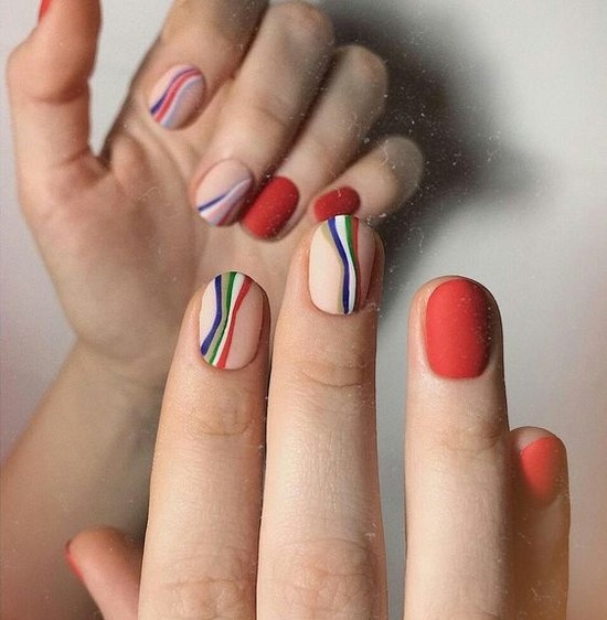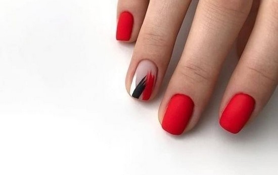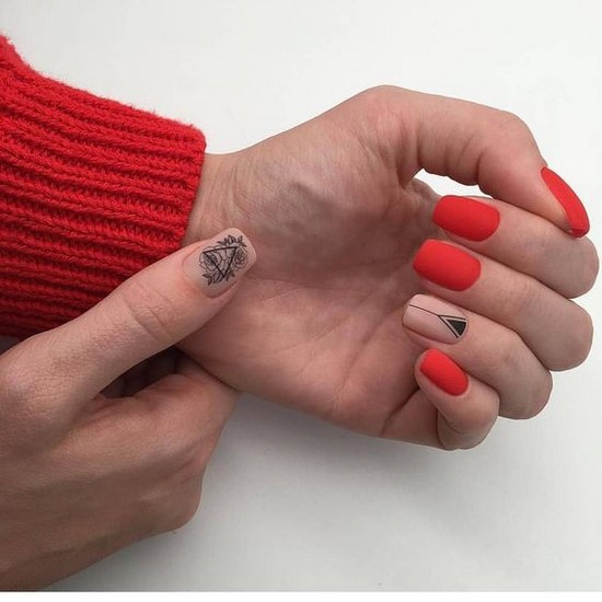 Le ressort rouge sur les ongles ne peut que servir d’accent, en particulier pour des techniques telles que les «œufs de caille», la «déchirure d’une licorne», la géométrie et le minimalisme.