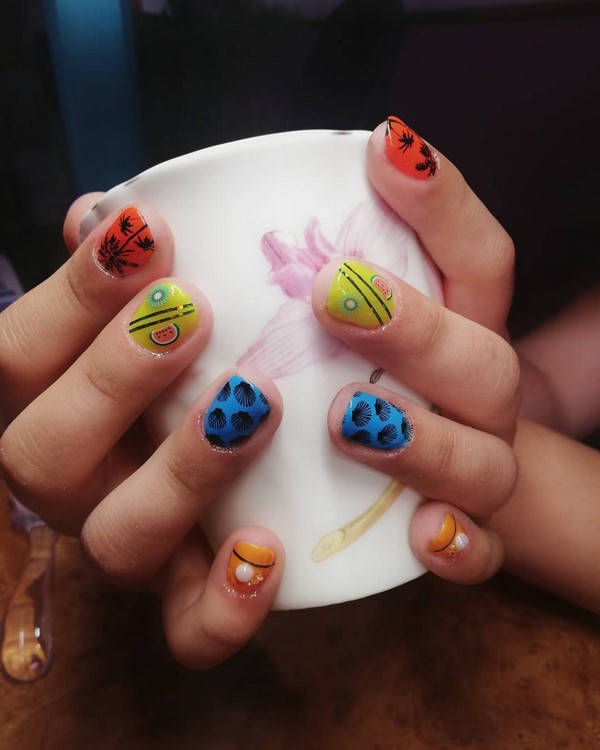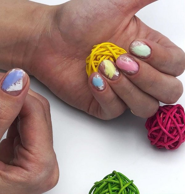 Combinez plusieurs tons pastel et modélisez une manucure douce sur des ongles carrés en utilisant du bleu, de la poudre, du soleil, de l'huile, du blanc, du violet et d'autres superbes teintes.