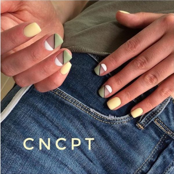 Aujourd’hui, le plus pertinent est la conception carrée d’ongles avec gel-polish, réalisée dans un style minimaliste, de solutions géométriques, de variations avec des dessins et des motifs.