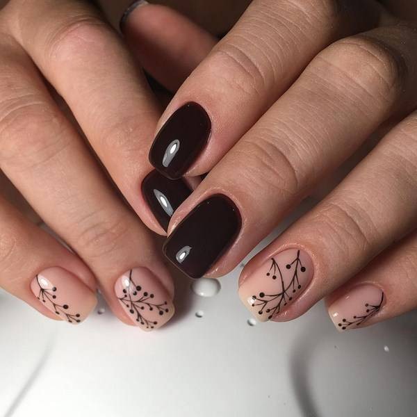 Les teintes sombres et profondes des vernis à gel ont une expressivité particulière. Par conséquent, en les appliquant sur des ongles carrés, vous créez une ambiance particulière pour le nail art et votre image dans son ensemble.