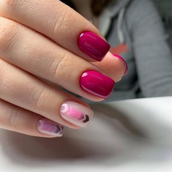 La première option de la liste des tendances est une manucure carrée dans un ombre brillant et non trivial avec ou sans motif, qui peut être réalisée selon de nombreuses interprétations, par exemple, linéaire, géométrique, traditionnelle, qui implique l’étirement de deux couleurs ou plus.