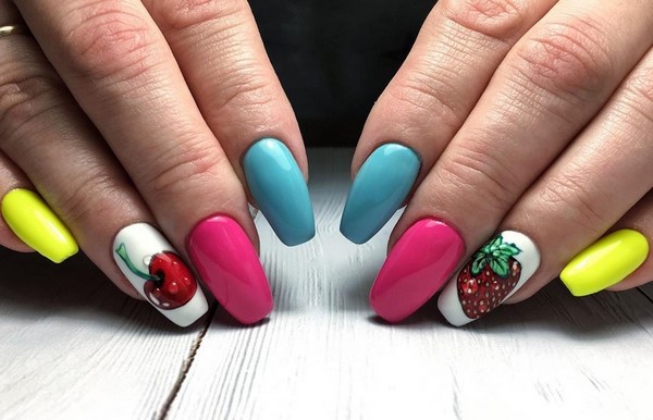 Décorez des ongles carrés brillants avec des dessins saisonniers délicieux, ainsi que de fantastiques notes florales, qui sont excellentes en combinaison avec des vernis gel framboise, rouge, vert, vert clair, orange, violet et beaucoup d'autres.