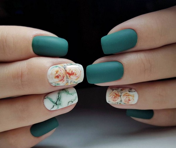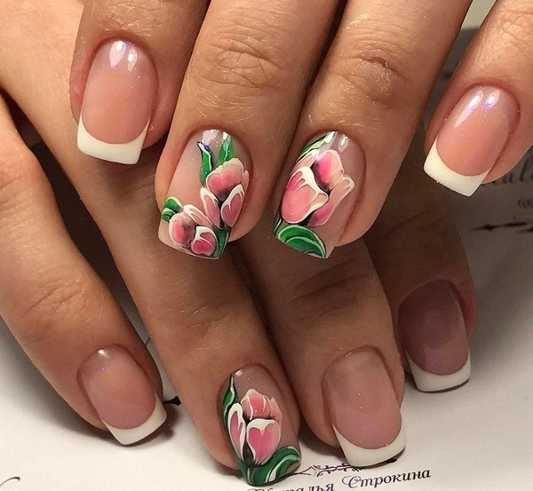 En outre, la tendance nous est familière depuis longtemps avec les solutions de nail art sous forme de manteau français, finition mate à fleurs, patins autocollants floraux, moulures, fleurs «sweet bloom», moulures à fleurs dorées, manucure à fleurs à la manière d'un voile, et il existe également de nombreux autres types de manucure de fleurs intriguants, dont une photo se trouve dans notre assemblage de photos.