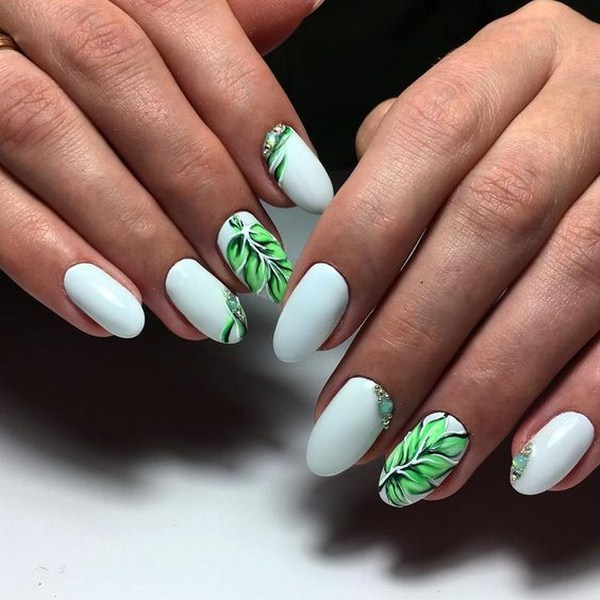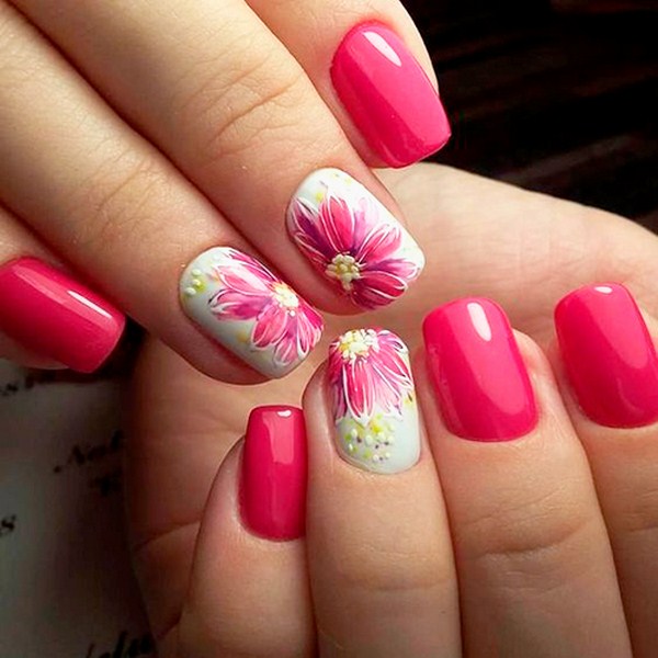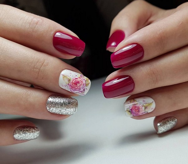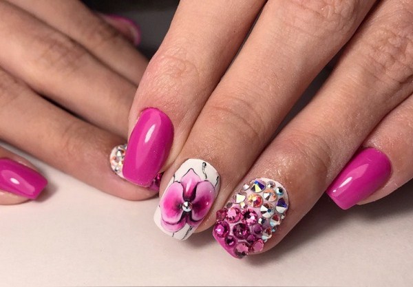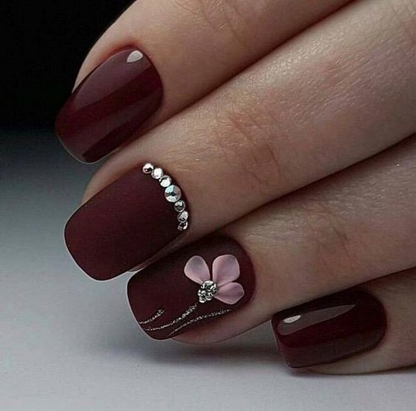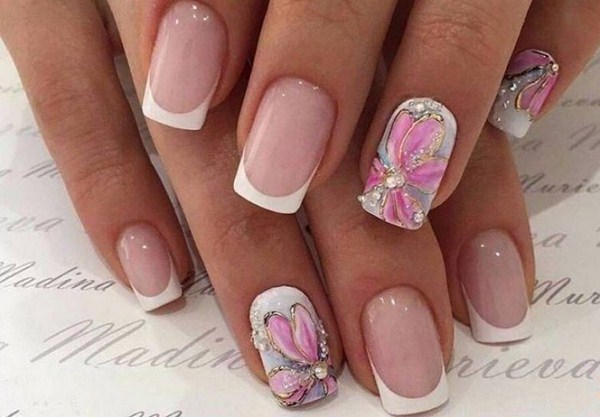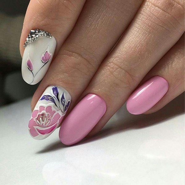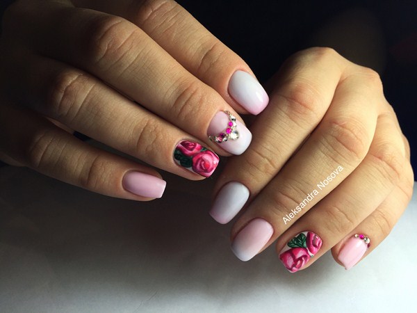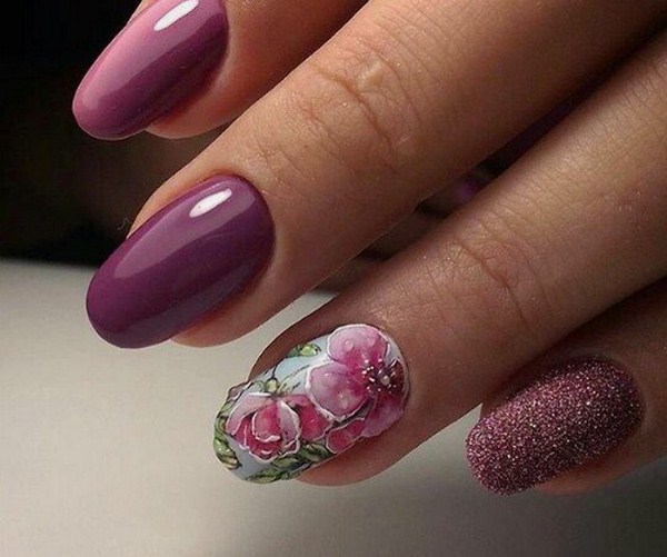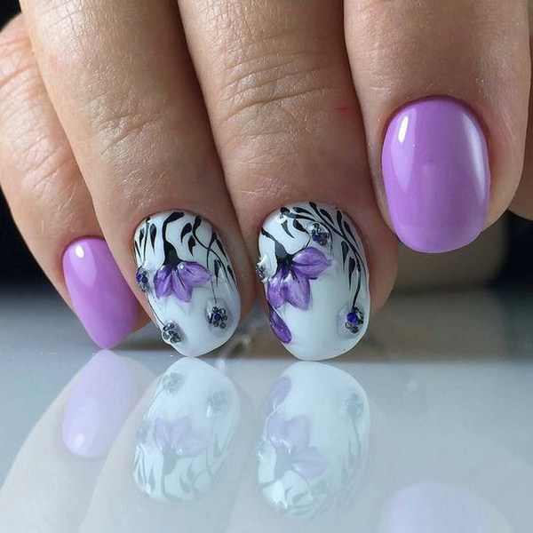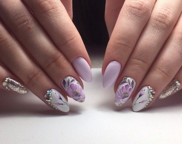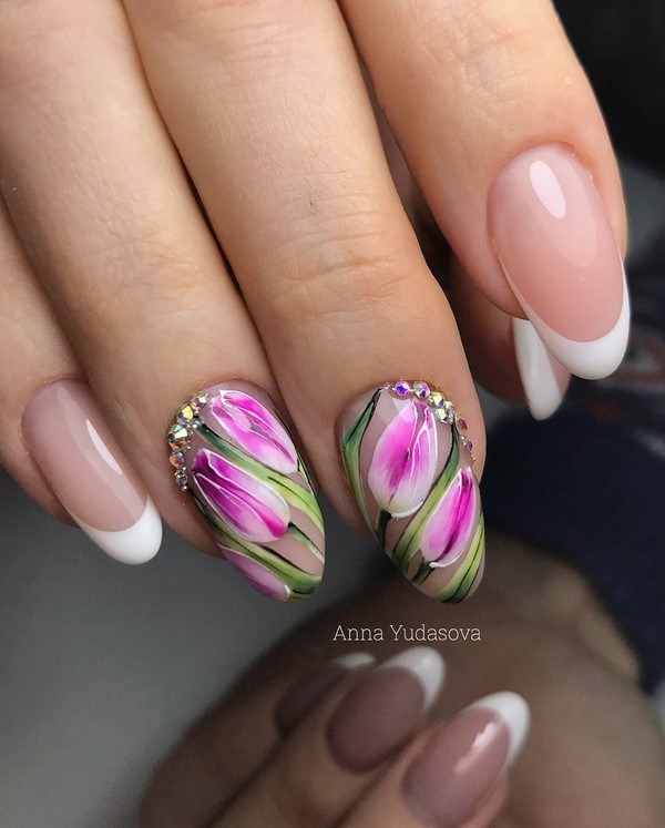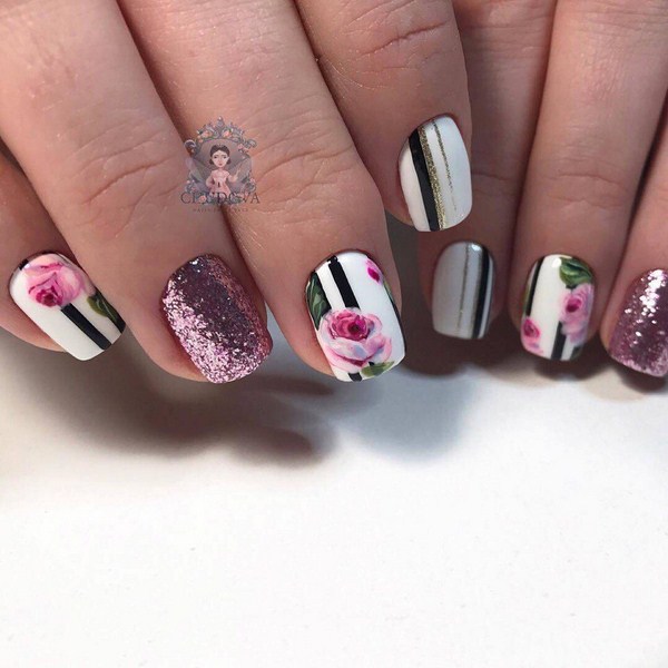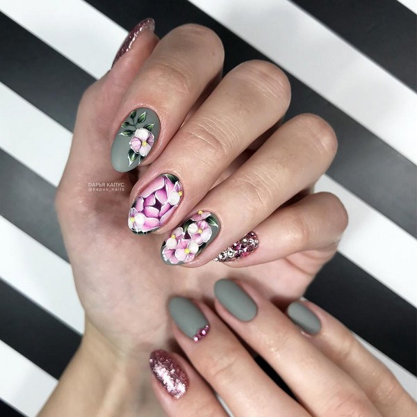 Une manucure florale aussi étonnante est souvent remplie de divers éléments décoratifs sous forme de feuille, frottement, floc, strass, etc.