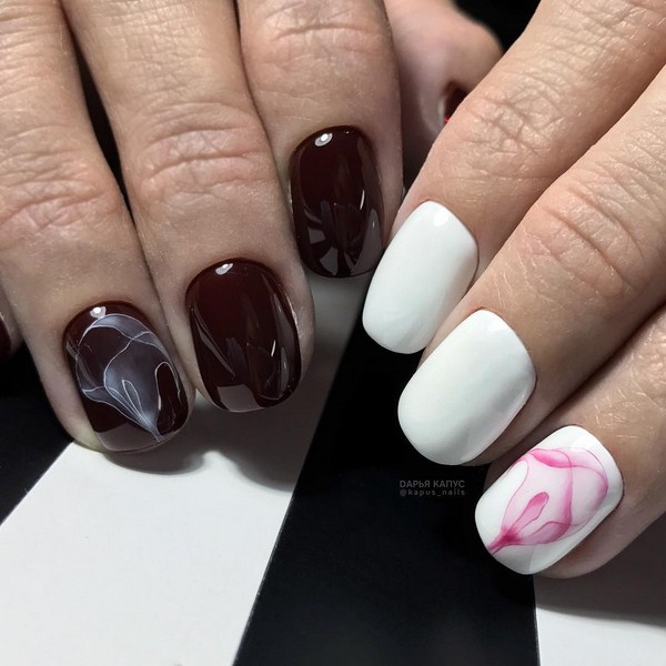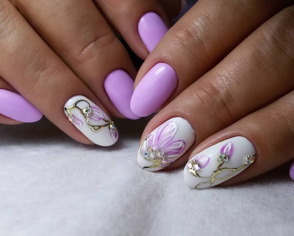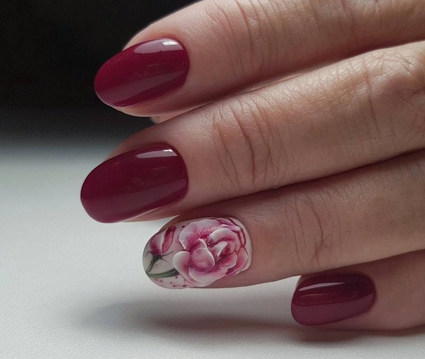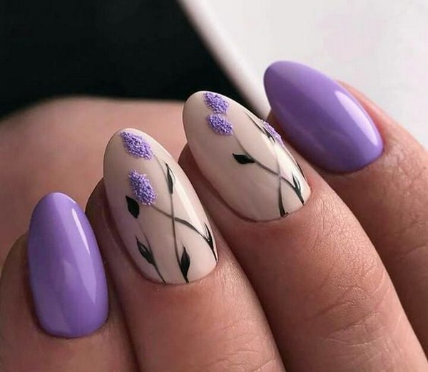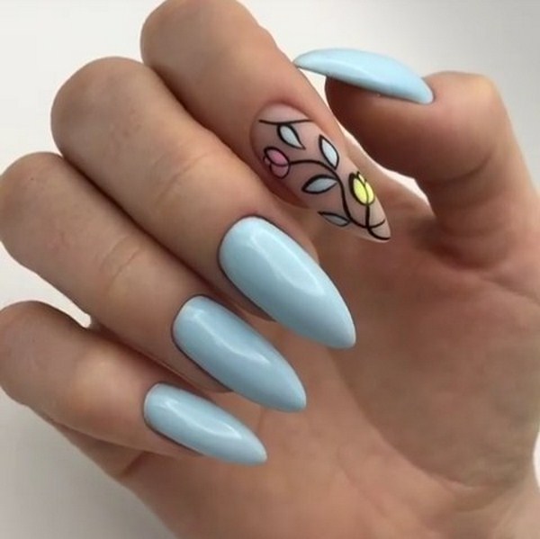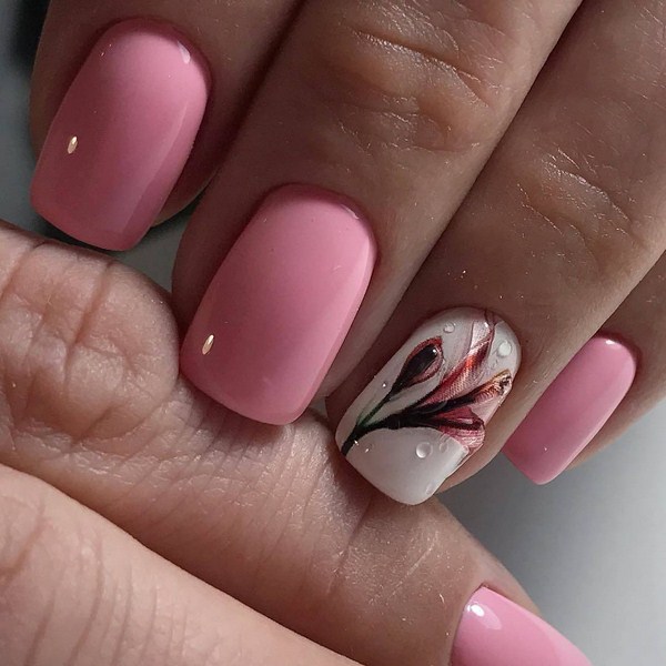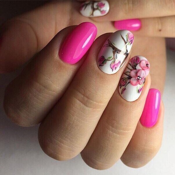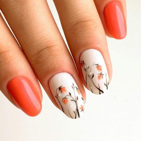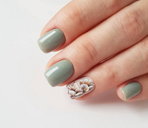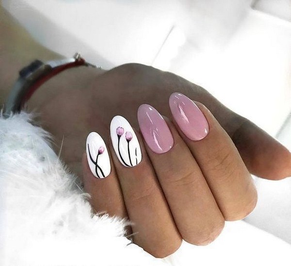 Vous pouvez appliquer différentes teintes de vernis dans un même dessin en utilisant la technique du minimalisme, en décorant un doigt avec un motif de fleurs petit et élégant sur une branche. Une telle manucure florale en forme de "minimalisme" plaira à des individus sophistiqués, créatifs et extraordinaires ayant une vision particulière du monde.