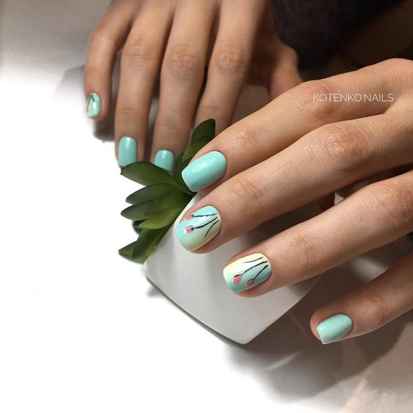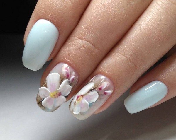 Pour appliquer la manucure avec des fleurs dans cette technique, le professionnalisme d'un spécialiste des ongles doit être au plus haut niveau. Mais les idées les plus étonnantes de manucure avec des fleurs et des brindilles de "fleurs aériennes" vous trouverez plus loin ...