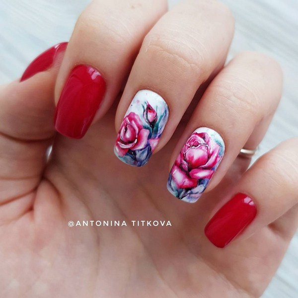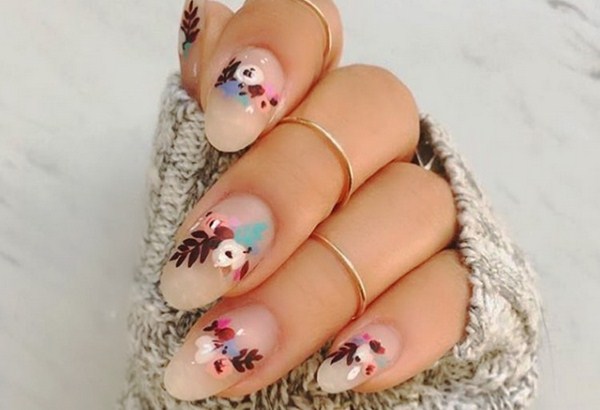 L'effet aquarelle peut être obtenu en peignant à l'aquarelle sur les ongles et le professionnalisme du cloueur, ainsi que la technique du "mouillé", qui permet d'obtenir l'effet aquarelle des dessins dans le motif floral des ongles.