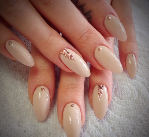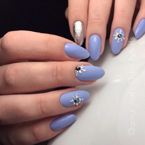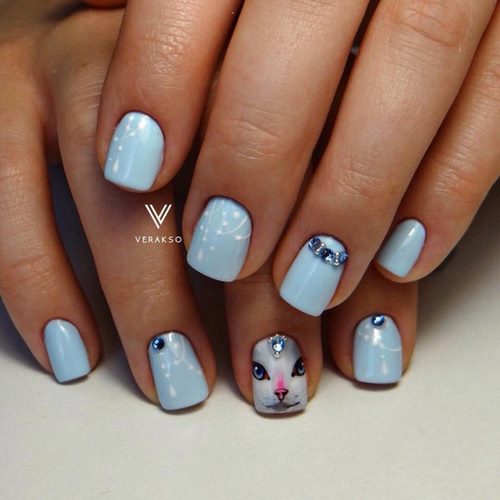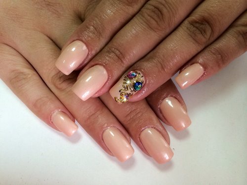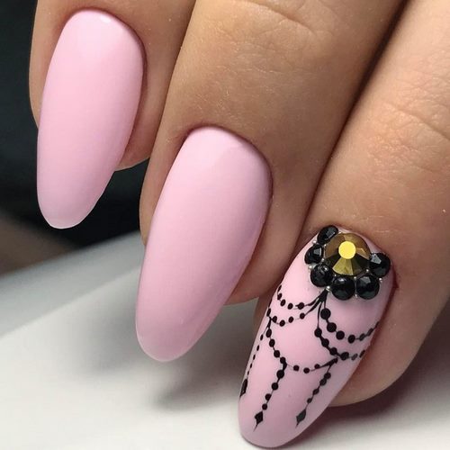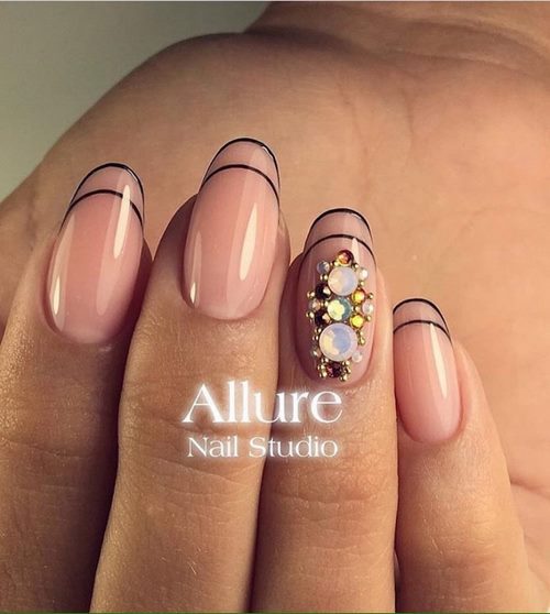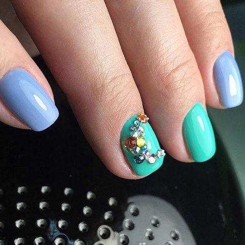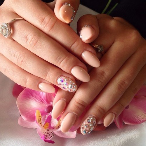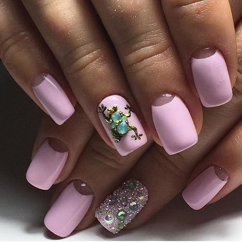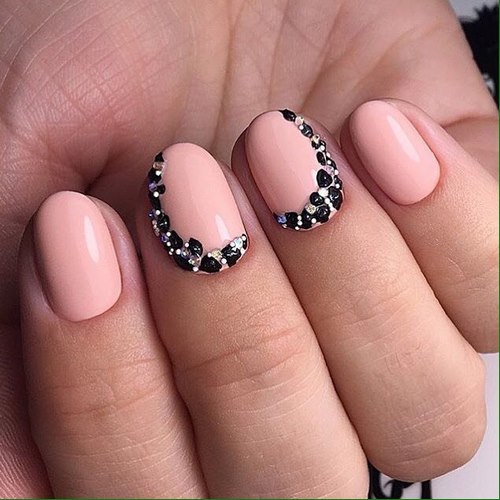 Récemment, une manucure avec des strass est devenue à la mode, dans laquelle un galet orne chaque ongle, complétant parfaitement le motif appliqué ou le dessin.