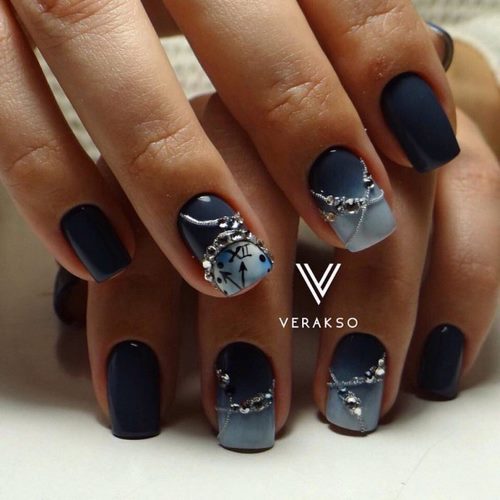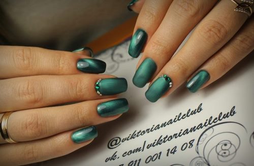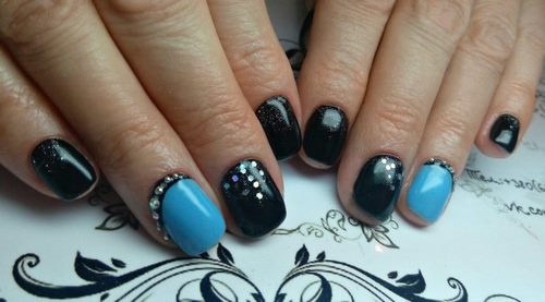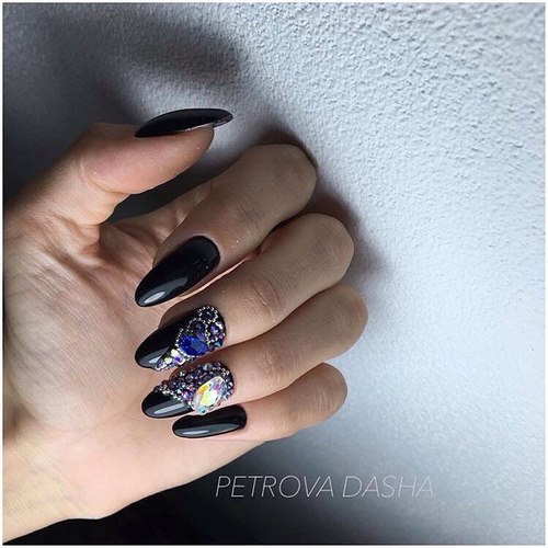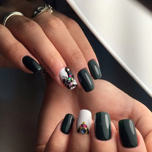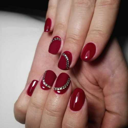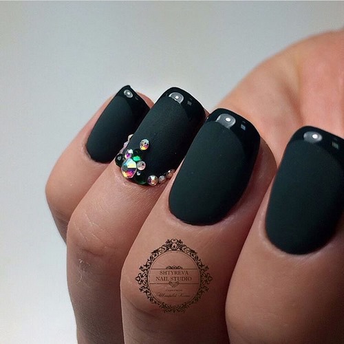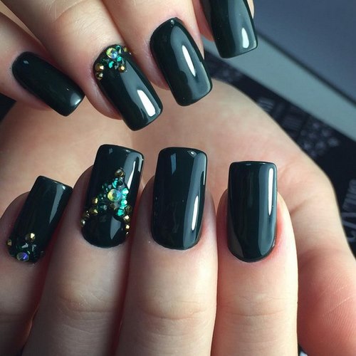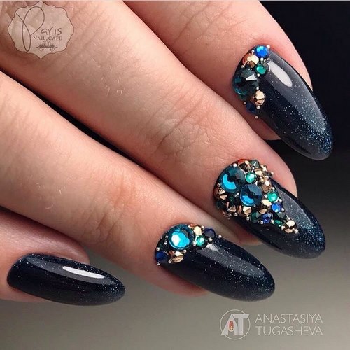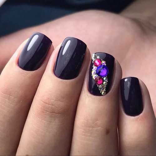 La conception des ongles avec des strass de rouge, vin, bleu, noir, vert, émeraude et autres nuances sombres sur une base mate ou brillante aura fière allure sur les ongles courts et longs.