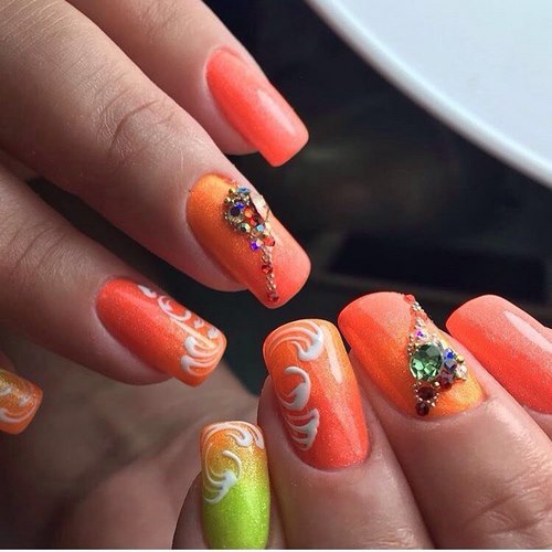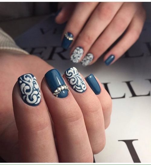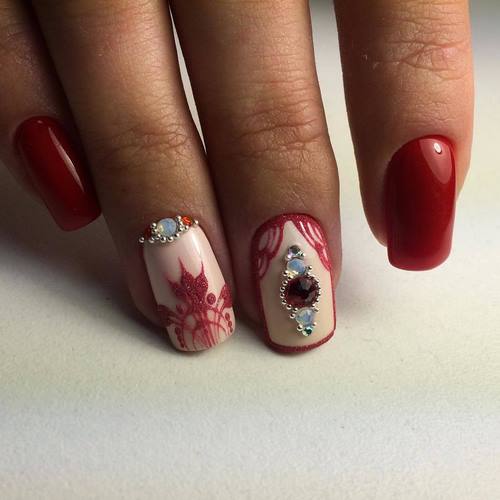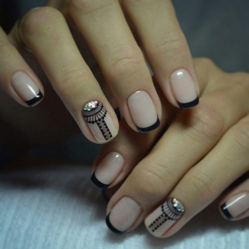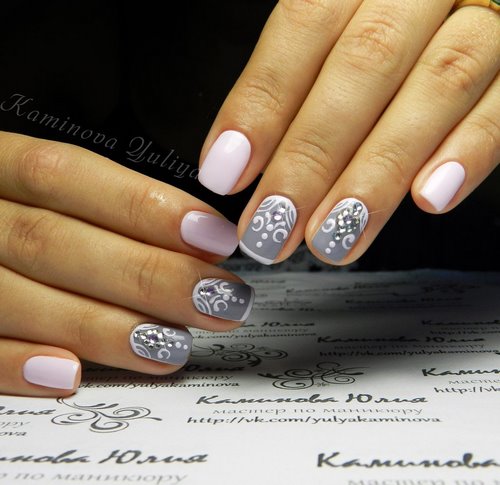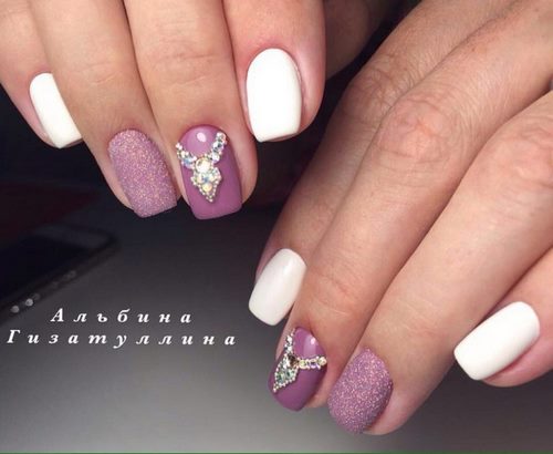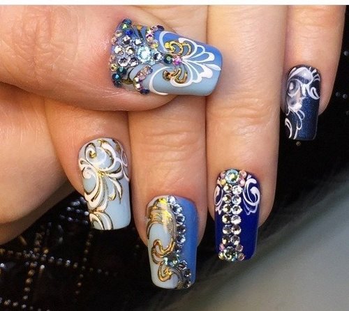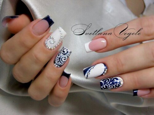 Nous notons immédiatement qu’une manucure avec des strass et un motif doit être modelée avec beaucoup de soin et de soin afin de ne pas avoir pour résultat une manucure vulgaire.