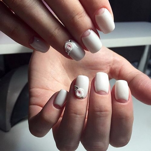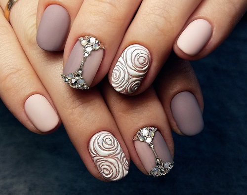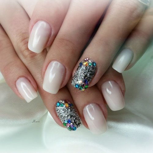 C'est une manucure de mariage avec des strass qui n'a pratiquement aucune limite, car ici, vous pouvez jouer avec les textures, le nombre et la couleur des galets, des motifs et des dessins avec du polissage au gel et des sculptures.