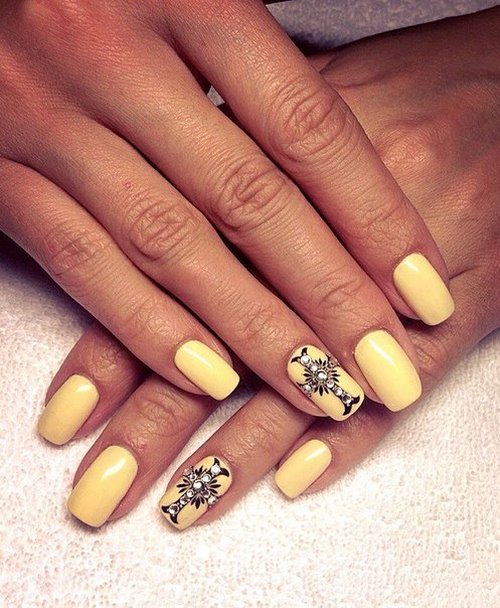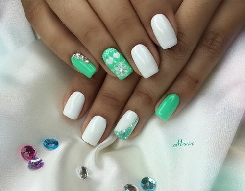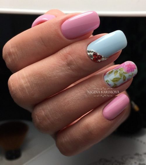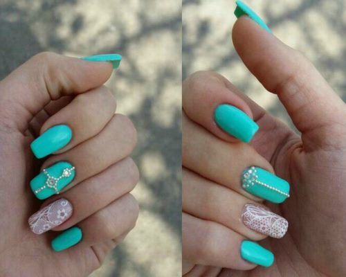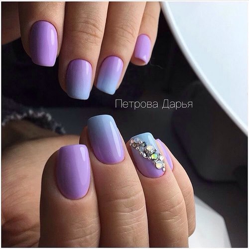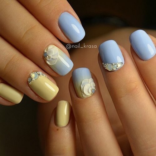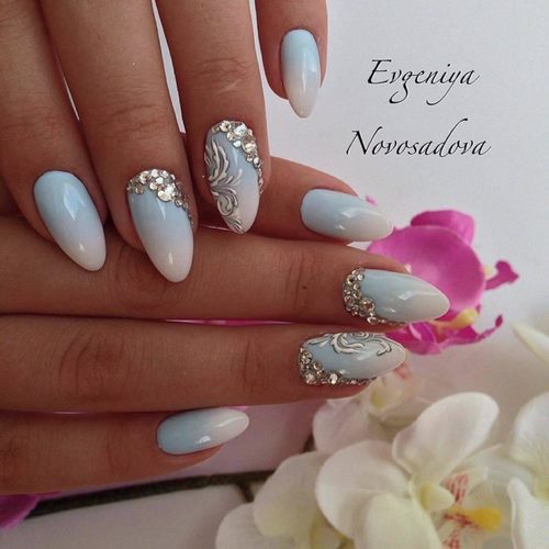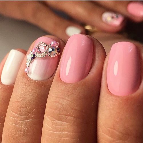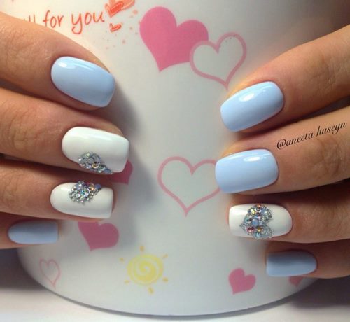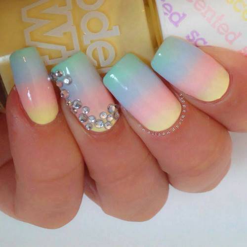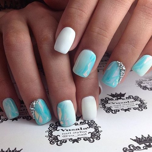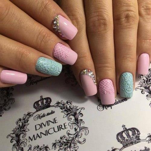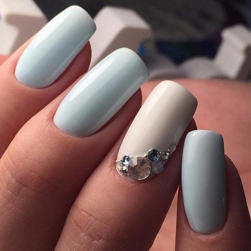 Des manucures délicates avec des strass peuvent être créées en utilisant du blanc, du rose pâle, du bleu ciel, du citron et toutes les nuances de pastel.
