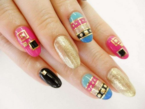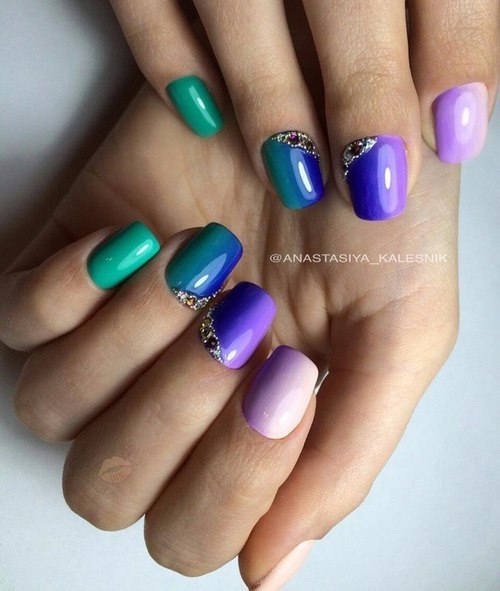 La conception verticale, horizontale et angulaire des ongles avec strass avec effet ombré dans des couleurs vives est une excellente option pour le nail art en été, et les nuances plus riches et les strass sont étonnants dans les manucures du Nouvel An et des fêtes.
