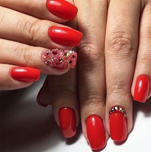 Les strass sur les ongles sous une forme ou une autre ont fière allure sur une base sombre, de sorte que des couleurs vives juteuses et des couleurs vives saturées ne feront que souligner la brillance et la luminosité des strass dans toute leur beauté.