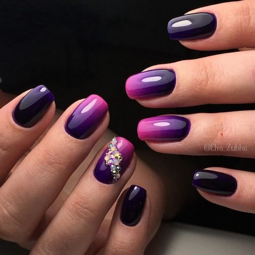 Le deuxième choix le plus populaire était une manucure avec des strass dans la technique du dégradé. Bien que le nail art dégradé lui-même soit très original, en le complétant avec des cailloux, vous ne soulignez que la beauté de vos ongles dans le débordement de teintes profondes de gel, de gel et de strass.