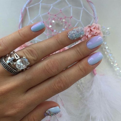 Des manucures délicates avec des strass peuvent être créées en utilisant du blanc, du rose pâle, du bleu ciel, du citron et toutes les nuances de pastel.