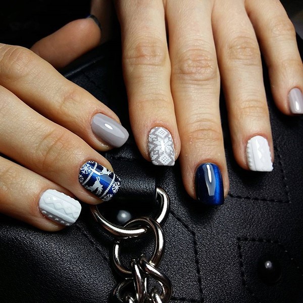 Vous pouvez ajouter de la variété aux agréables nuances de pastel et de nu dans un motif de clou pour chandail tricoté utilisant plusieurs couleurs dans un motif sur des doigts différents. Des motifs tricotés multicolores ressemblent à des manucures sur les ongles, un pull très mignon et attrayant. Il est toujours à la mode d'ajouter de la poudre acrylique à un nail art tricoté en plusieurs couleurs pour donner un effet velours. Des paillettes de paillettes sont également appropriées ou un couple de cailloux laconiques. Une excellente combinaison de rouge-blanc, chocolat au lait, gris pêche, bleu et bleu ou blanc.
