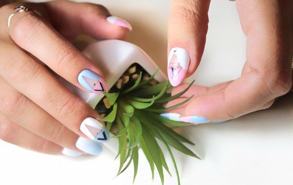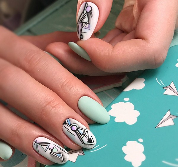 Comme nous l’avons déjà dit, la manucure géométrique à la mode implique une combinaison de styles, de solutions et d’approches. Il en résulte une manucure de géométrie merveilleuse avec des croquis d'animaux ressemblant à des dessins en origami. La conception géométrique inhabituelle avec losanges, triangles et lignes a l'air très audacieuse et non triviale, vous permettant de vous vanter d'un art graphique géométrique très élégant sur les ongles.
