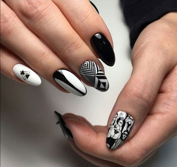 De droit, on peut considérer comme des graphiques en noir et blanc l’un des dessins d’ongles traditionnels et non moins intéressants. Et tout cela parce que les tons contrastés se retrouvent dans toutes les variations de la manucure, la géométrie est étonnante et harmonieuse, elle s’intègre dans n’importe quel style de vêtement et de type de clou. Vous pouvez dessiner différents ornements géométriques sur les ongles en noir et blanc: pois, cage, rayures, silhouettes et portraits, ainsi que tout ce que vous aimez.