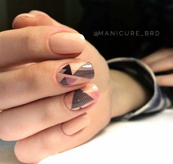 À l’automne, les manucures «géométriques» à la mode avec un dégradé, l’origami et d’autres types de manucure géométrique avec un vernis mat et brillant dans une couleur chaude seront jolies.