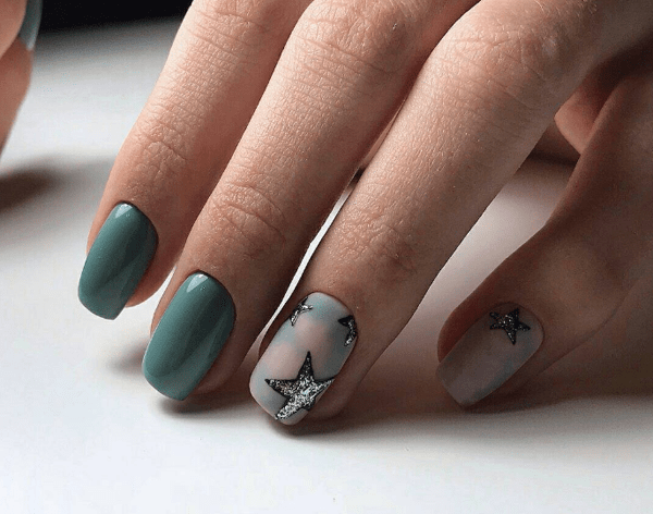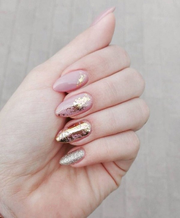 Vous pouvez facilement créer des vacances sur vos ongles, et cela vous aidera à faire des confettis ou des kamifubuki. Si en été, vous pouvez voir des décorations colorées, alors pour la manucure d'automne, procurez-vous des confettis d'or, d'argent et de beige pour une douce manucure d'automne. Manucure d’automne festive vous permettant de diversifier le kamifubuki dans les tons bleu, bordeaux et orange.