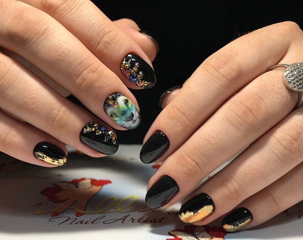 La conception moderne des ongles à l’automne ne pourra pas se passer de dessins et de peintures murales. Les styles d’imprimés pour les manucures à la mode de l’automne ont de nombreuses représentations - peintures de portraits de fillettes, images d’animaux, prospectus, fleurs, etc. N'importe quel sujet peut servir de thème à un dessin pour le nail art d'automne, en commençant par une tasse à café et un parapluie, pour finir par des paysages d'automne. Utilisez des tons jaunes-oranges et calmes de vernis à ongles pour la manucure pour l'automne avec des dessins 2025-2026.