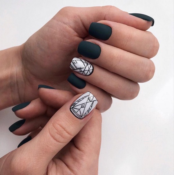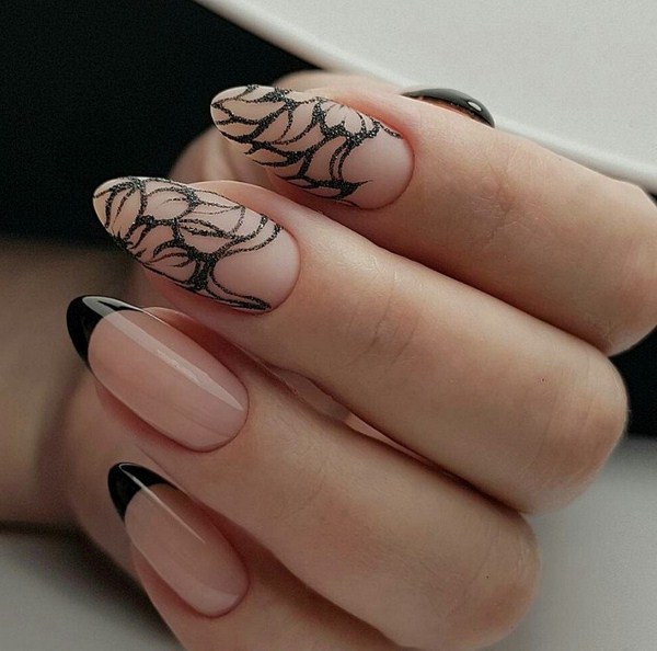 Ne faites pas dans la conception d'automne des ongles sans dessins, comme traditionnel avec des feuilles, des parapluies, des renards. Les fleurs, la géométrie et les motifs abstraits seront populaires. On peut ajouter de la tendresse à la manucure d'automne 2025-2026 en utilisant de la dentelle, de la poudre acrylique et un effet mat.