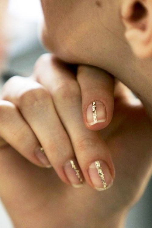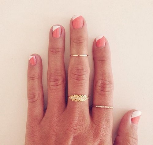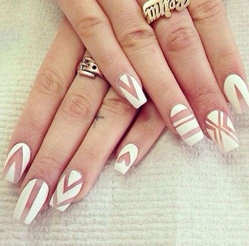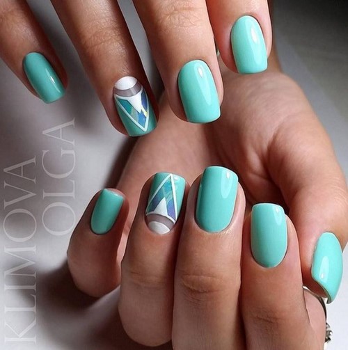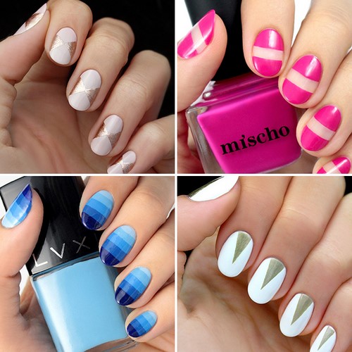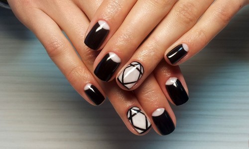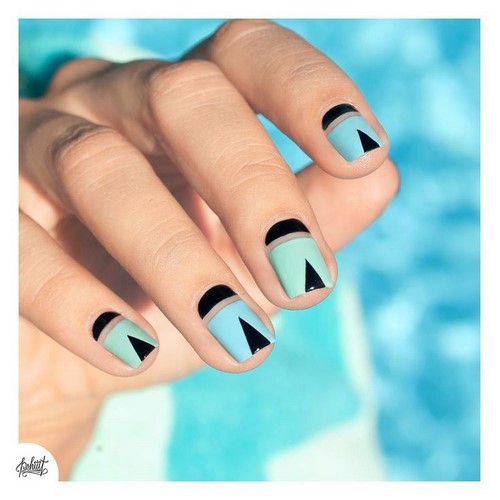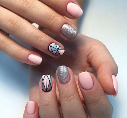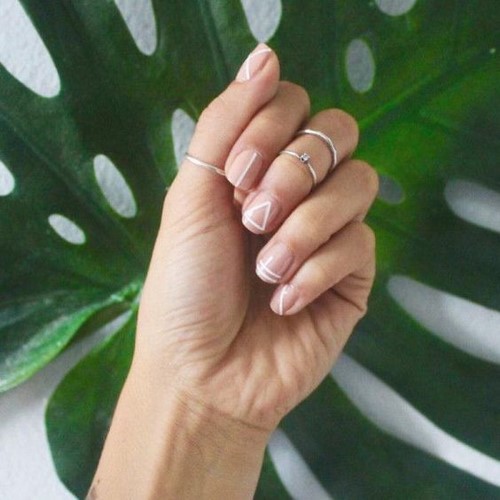 Comme les années précédentes, manucure à la mode avec motif géométrique aussi bien design ongle branché Espace négatif. Avec cette technique, tout l'ongle n'est pas verni, mais seulement un certain motif sur la plaque de l'ongle.