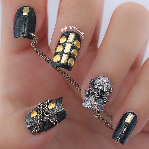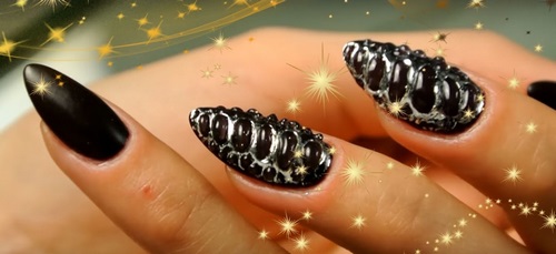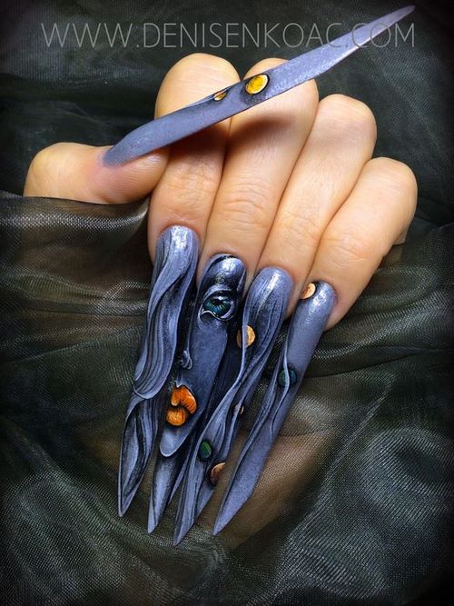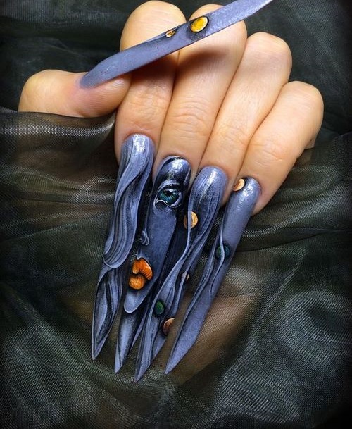 Une manucure aussi inhabituelle est choisie par les vedettes du spectacle qui ne craignent pas les expériences et sont prêtes à ce que le public se souvienne de tout, ainsi que les filles et les femmes qui préfèrent un style rocker à leurs vêtements.