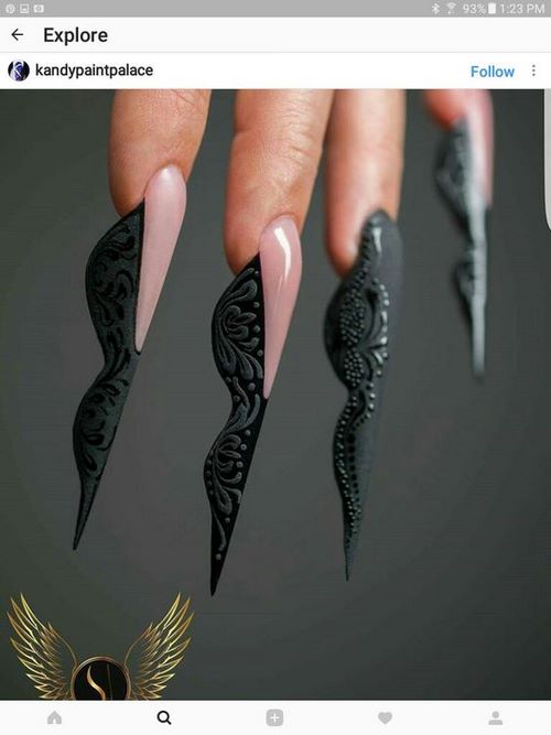 Néanmoins, une manucure en stuc inhabituelle, qui est souvent réalisée sur des ongles pointus et longs, peut être si inattendue qu'elle peut même choquer les gens qui envisageront des figures en acrylique ou en gel et avec des compositions florales lumineuses.