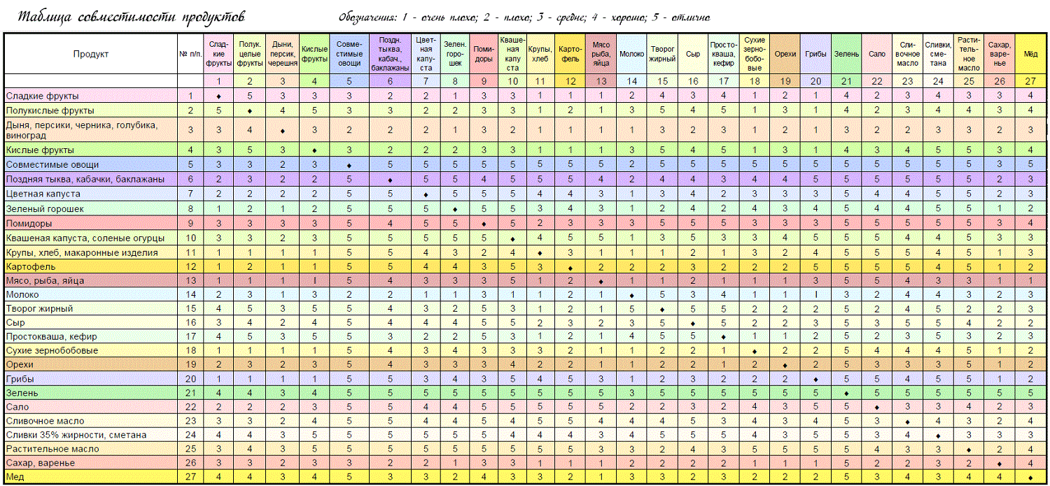 Et maintenant, nous attirons votre attention sur un tableau utile de compatibilité alimentaire, selon lequel vous pouvez créer le meilleur menu pour vous-même et devenir un adepte d'une nutrition appropriée.