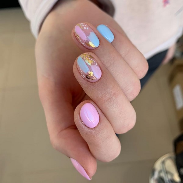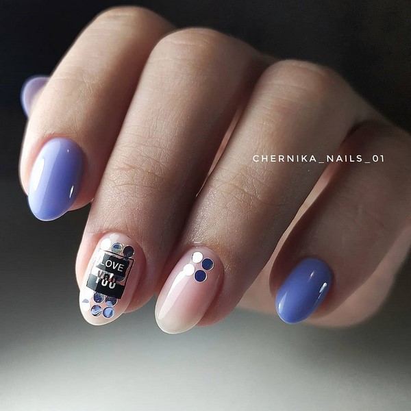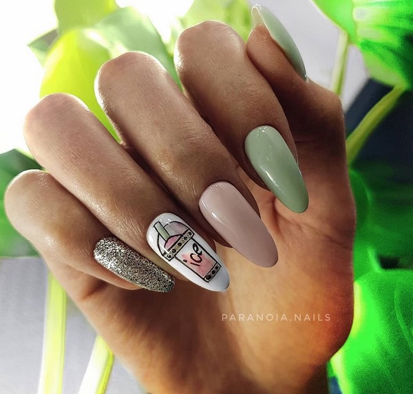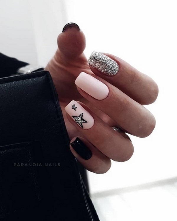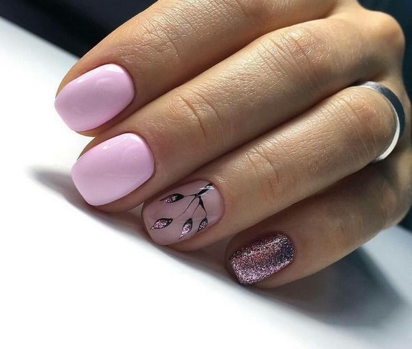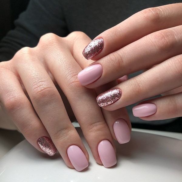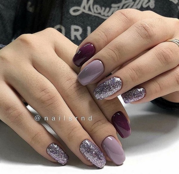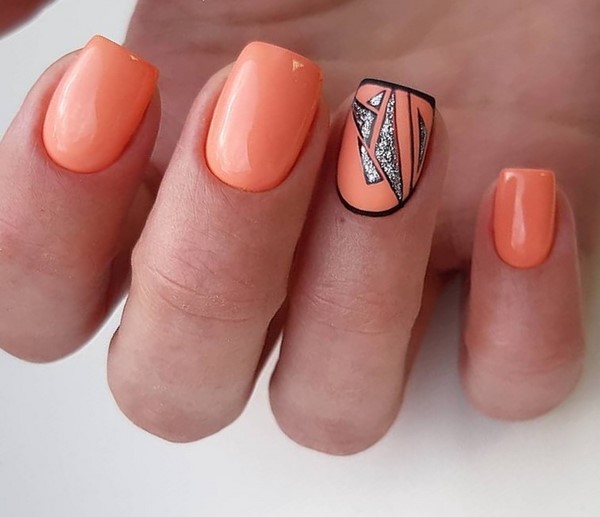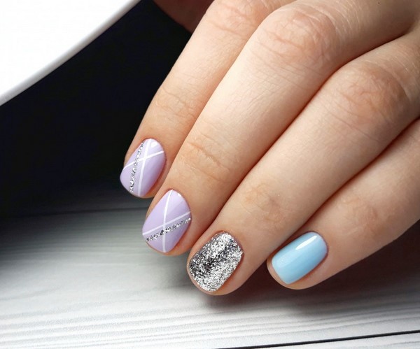 Sparkles aidera à rendre les ongles courts élégants et glamour. Pour ce faire, il suffit de recouvrir l’un des doigts de paillettes, de décorer le pouce avec un motif et d’utiliser d’intéressantes teintes de vernis gel sur les ongles libres. Pas moins impressionnant sur les ongles courts avec des étincelles se verra offrir un imprimé géométrique et un design de lune.