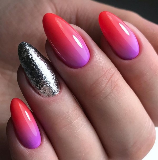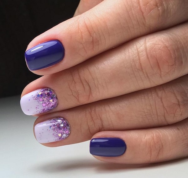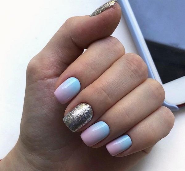 Le design des ongles Ombre en lui-même sera très brillant, efficace et attrayant. Mais parfois, vous souhaitez diversifier la manucure à gradient habituelle en utilisant des paillettes, du papier d'aluminium ou des confettis brillants. Avec leur aide, les maîtres proposent de compléter le design en dégradé tendance des ongles, en se concentrant sur un ou deux doigts à l'aide d'étincelles.