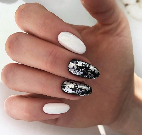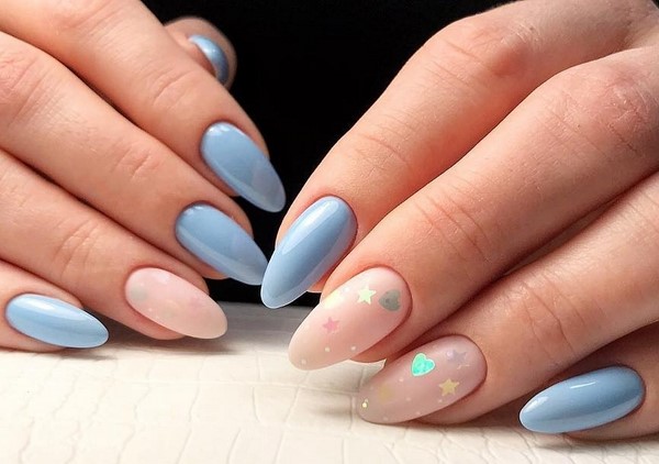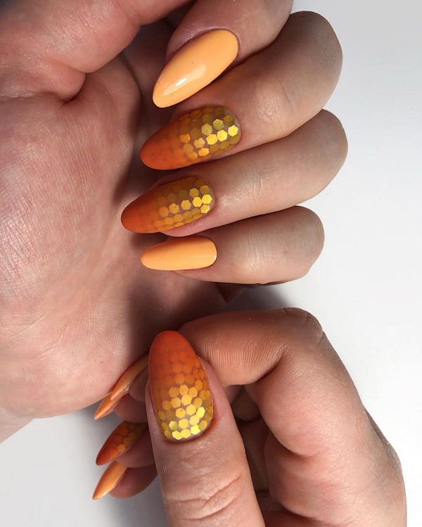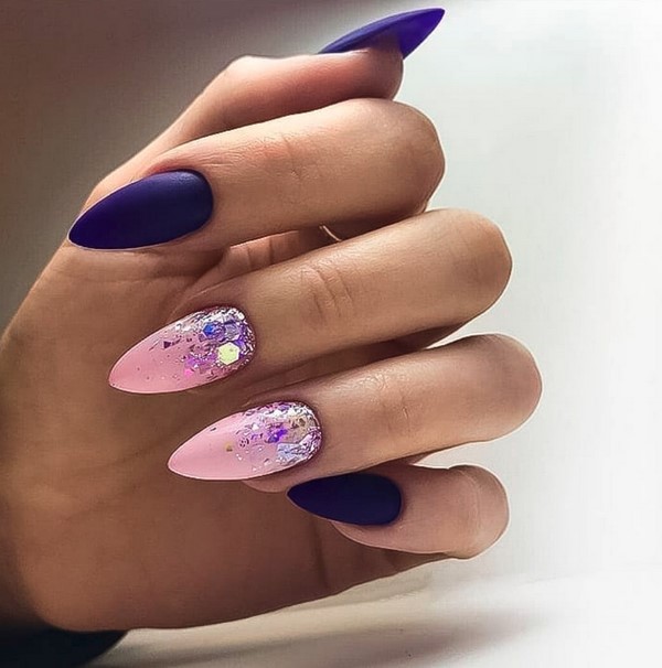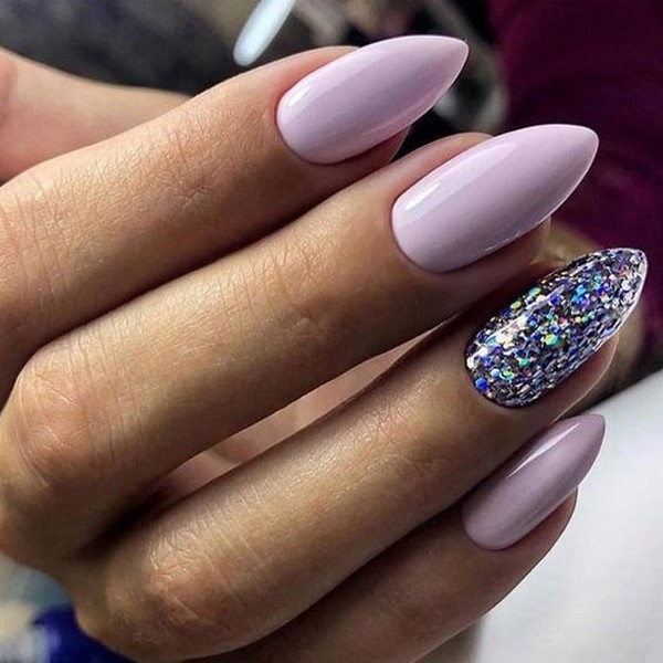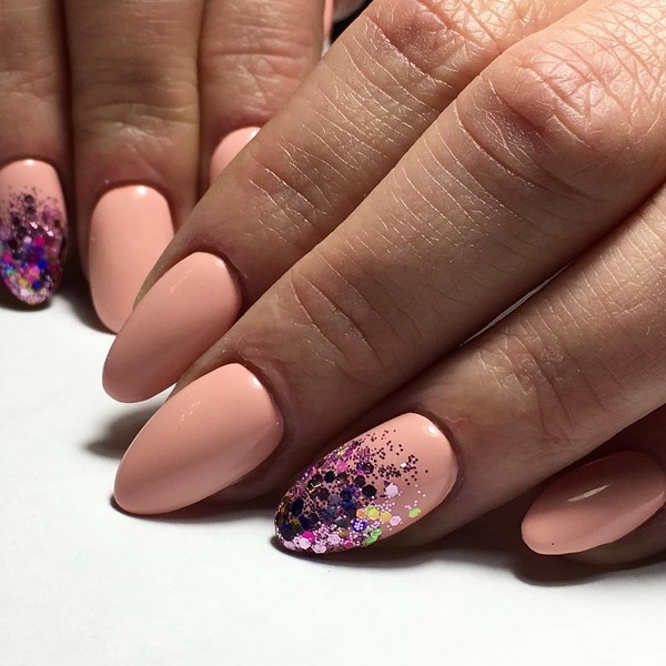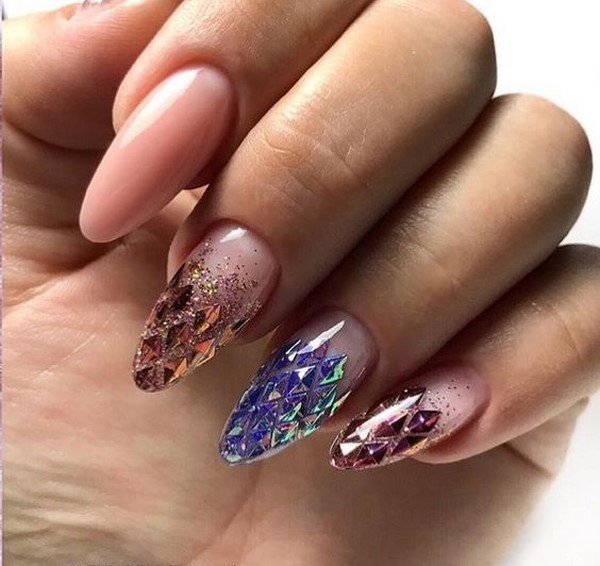 En appliquant des paillettes dans un charmant design de manucure avec des étincelles, vous pouvez obtenir un effet très attrayant et excitant sur vos doigts. Les paillettes chics vous permettent d'ajouter de la profondeur au design à la mode de la manucure avec des étincelles. Des paillettes similaires conviendront mieux à de longs soucis en forme d’amande.