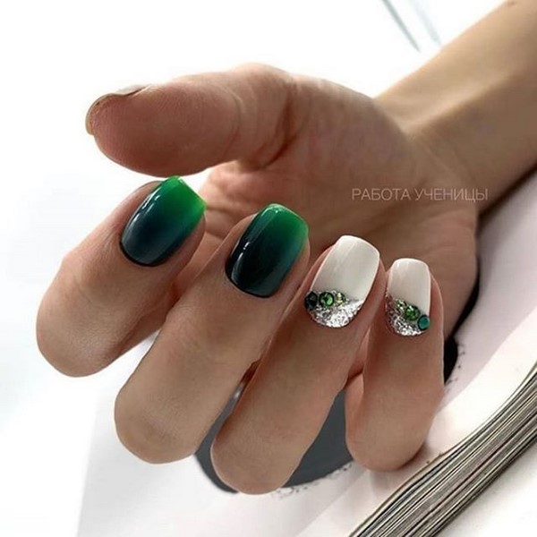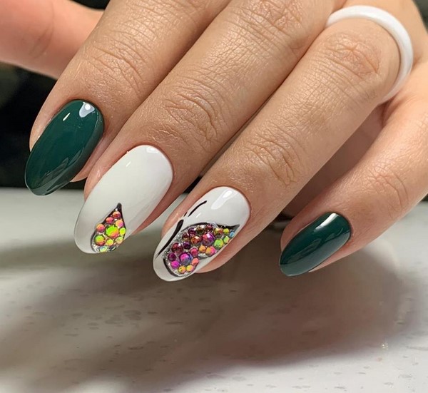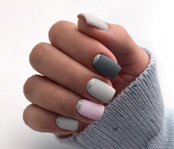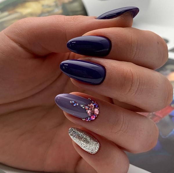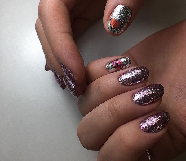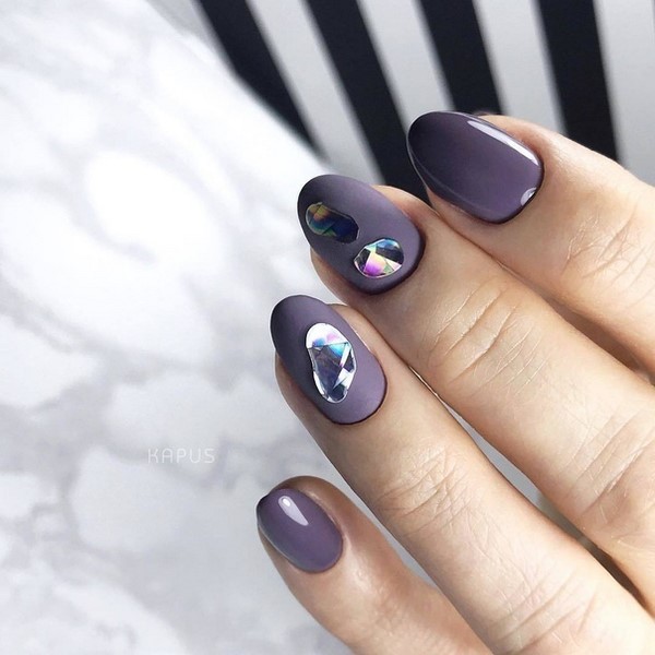 En outre, une solution à la mode consiste à mettre en valeur les doigts avec des étincelles lorsque les maîtres recouvrent toute la surface de la plaque avec des paillettes spectaculaires. Incroyablement chic ressemblera à des étincelles dans une manucure géométrique, dans la conception d’ongles avec strass, avec un design d’ongle mat, peint sous la forme de dessins créatifs sur les ongles.
